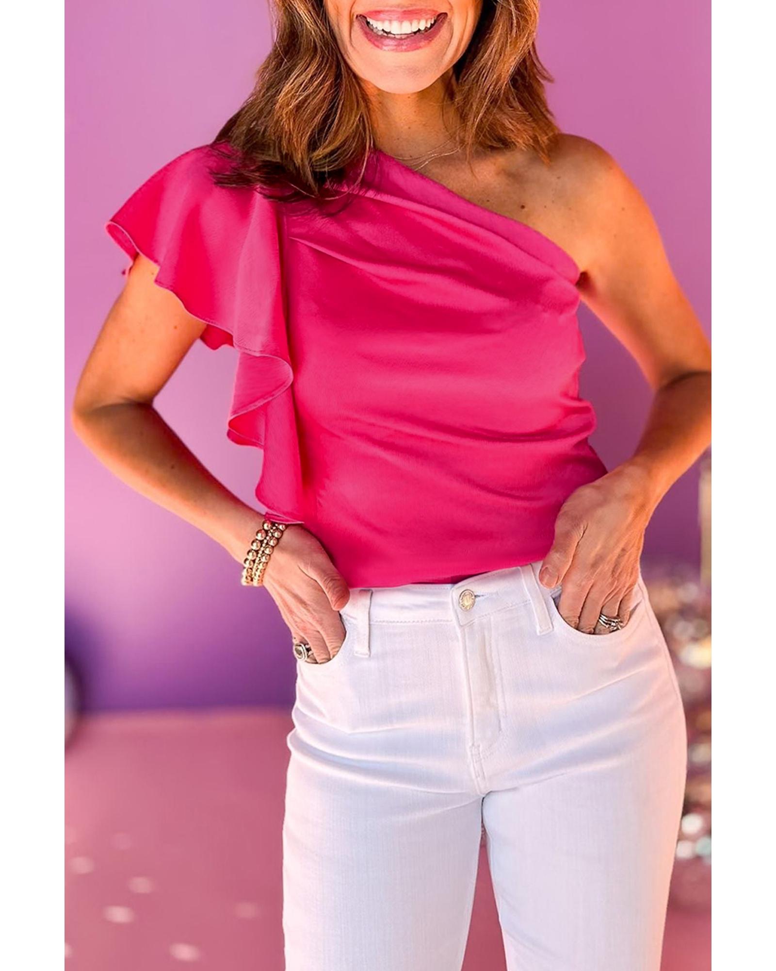 Strawberry Pink Asymmetric Shoulder Ruffle Sleeve Elegant Blouse – XL