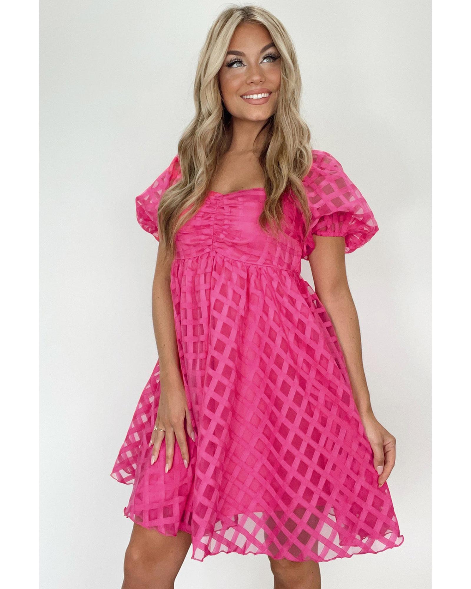 - Chic and classic Strawberry Pink Checkered Puff Sleeve Babydoll Dress