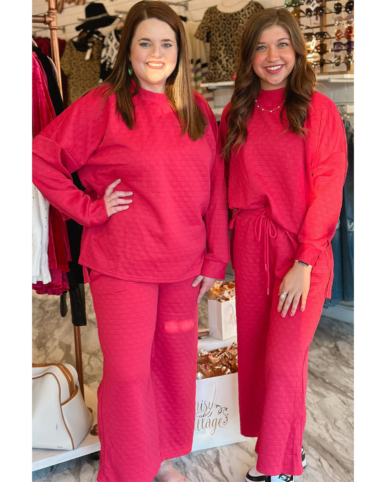 • Strawberry Pink Checkered Textured Split Pullover Top and Pants Set