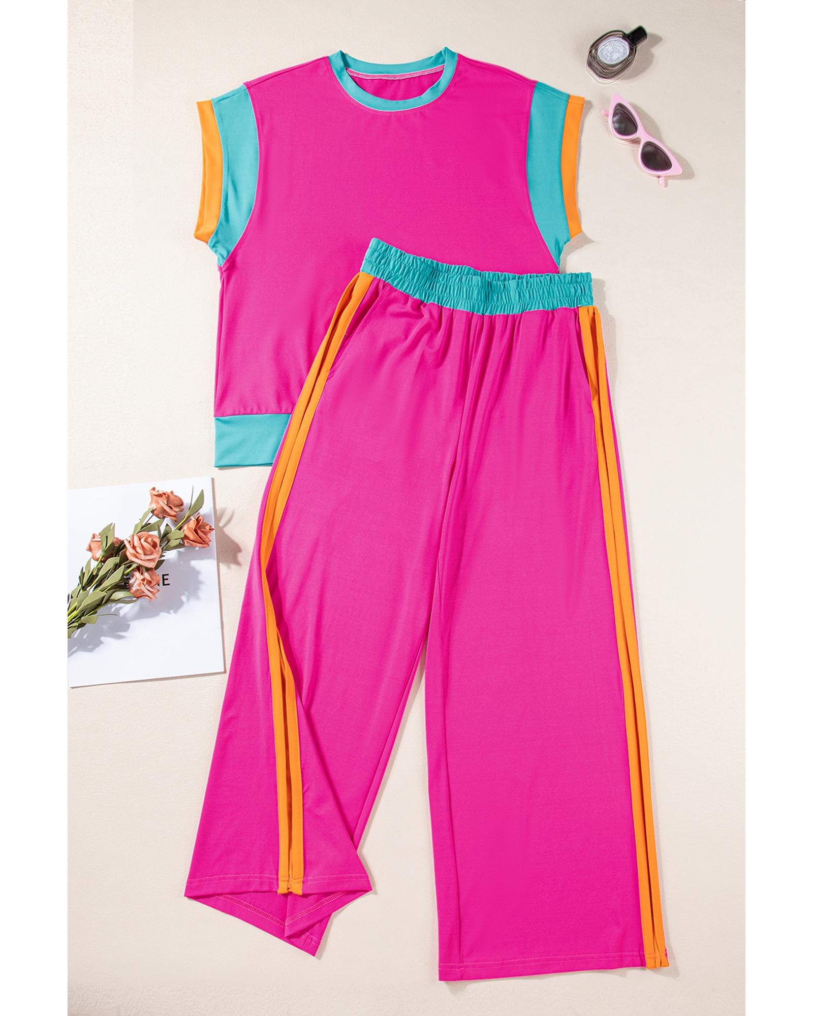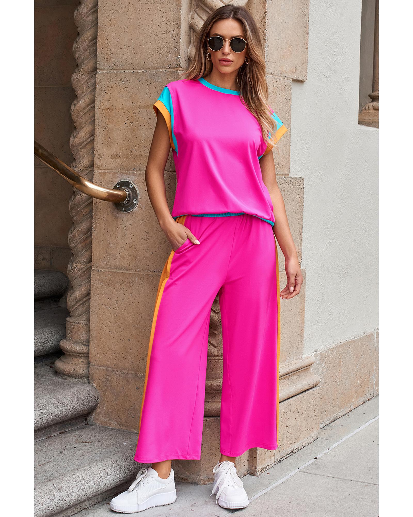 Strawberry Pink Color Block Detail Casual Two-piece Set – S