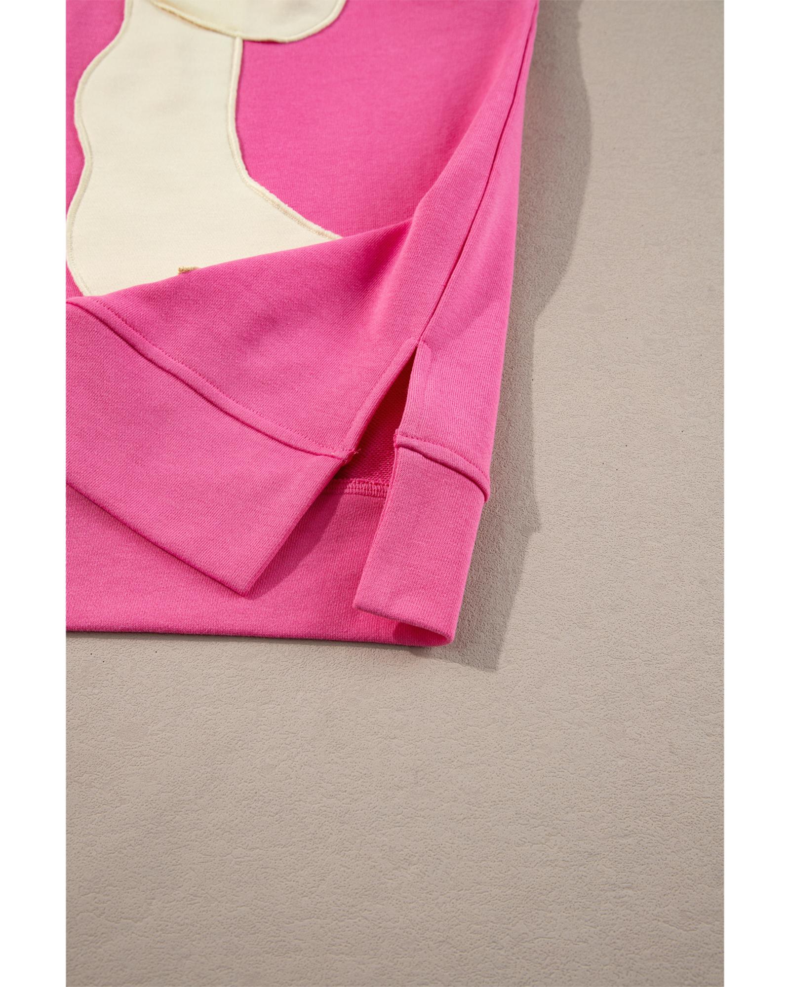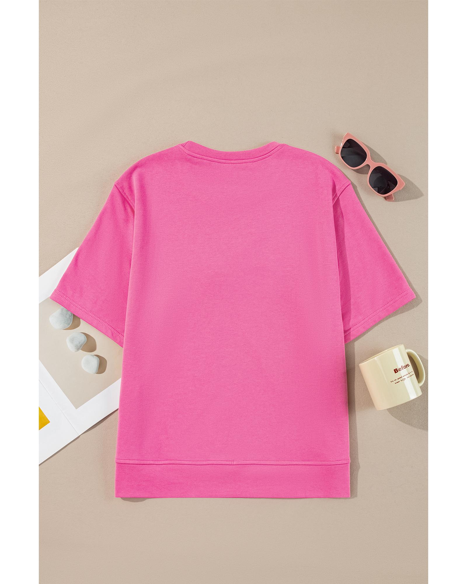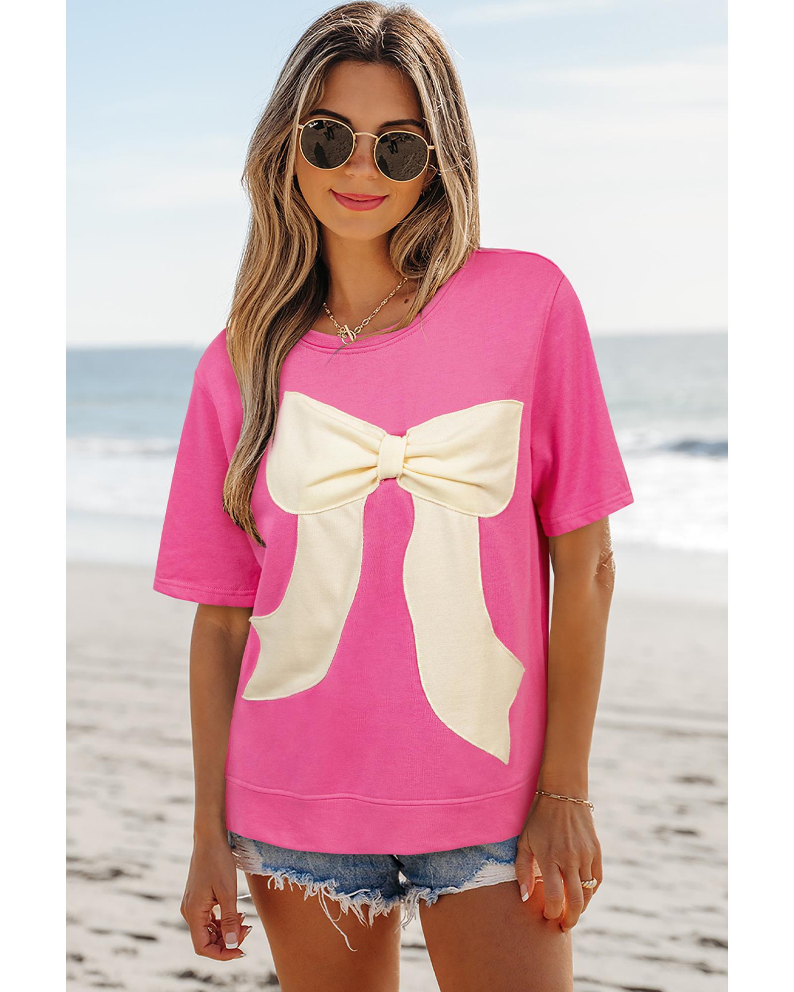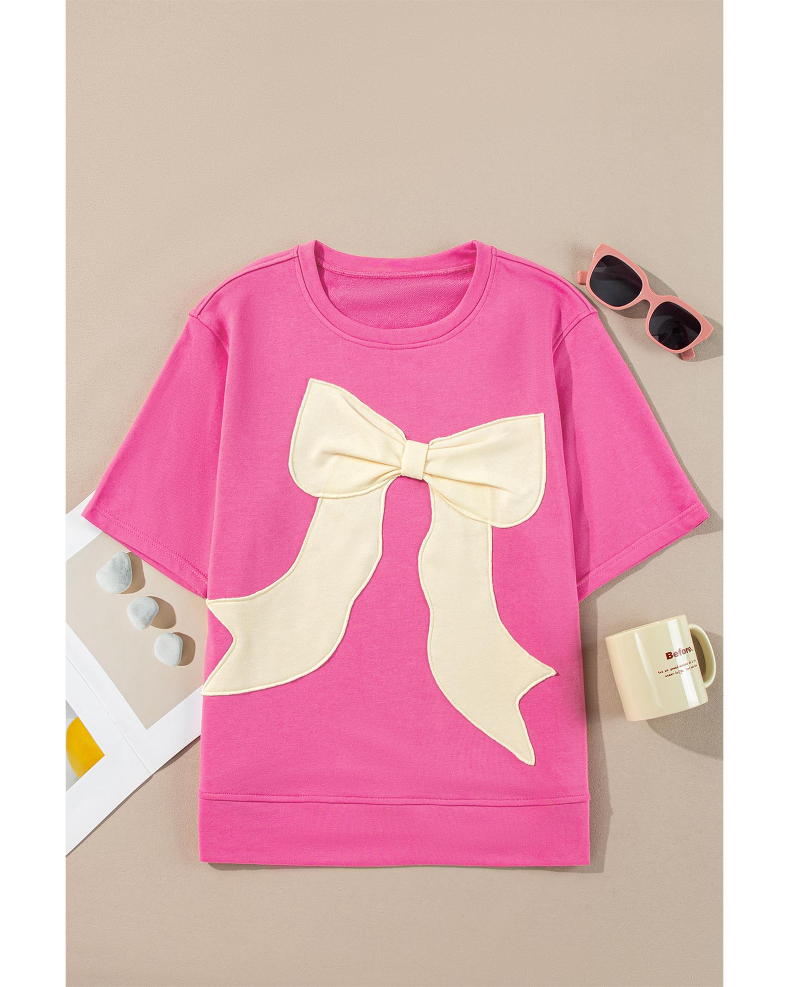 Strawberry Pink Contrasting Color Ribbon Bow Front Patch Loose Tee with Slits – L