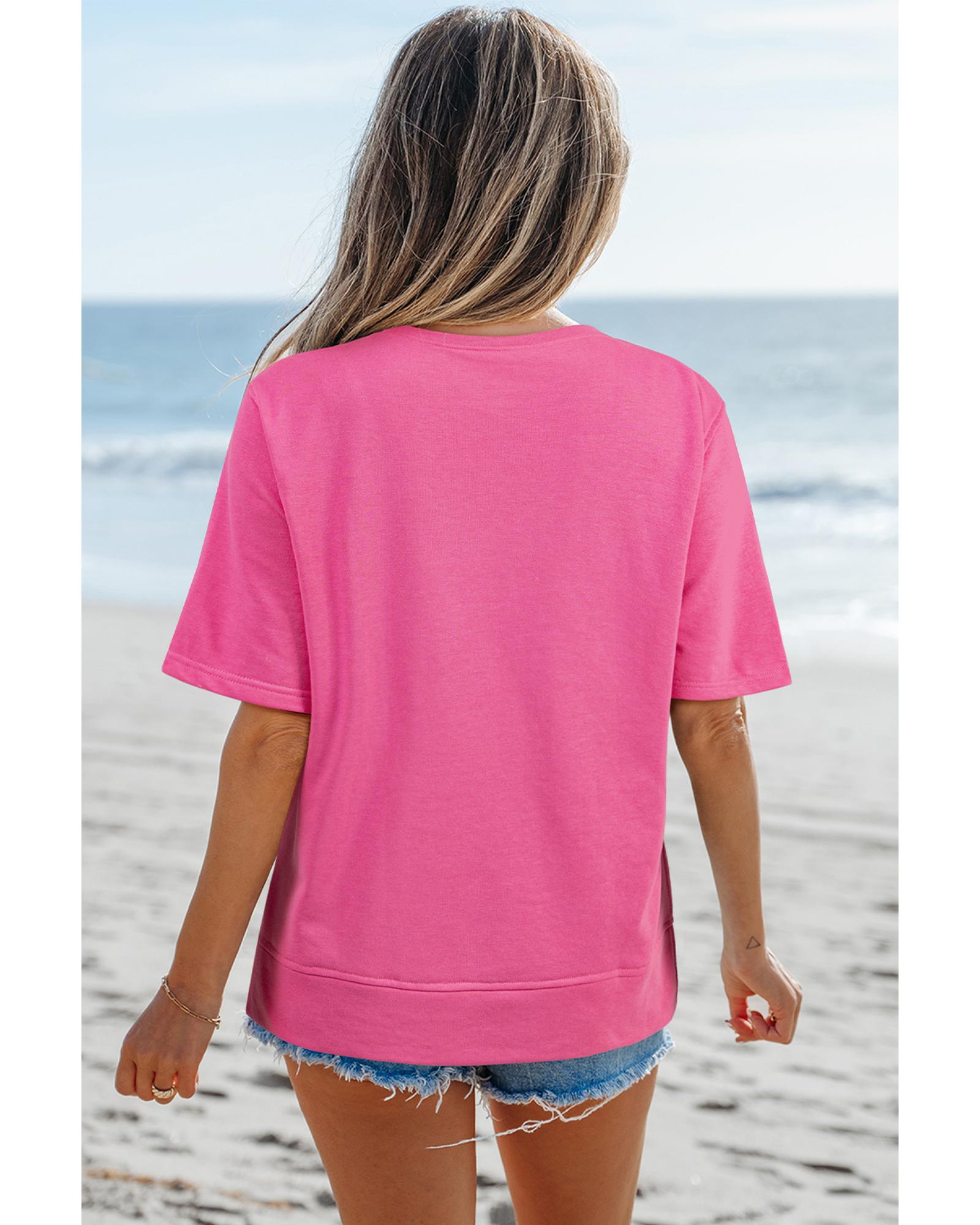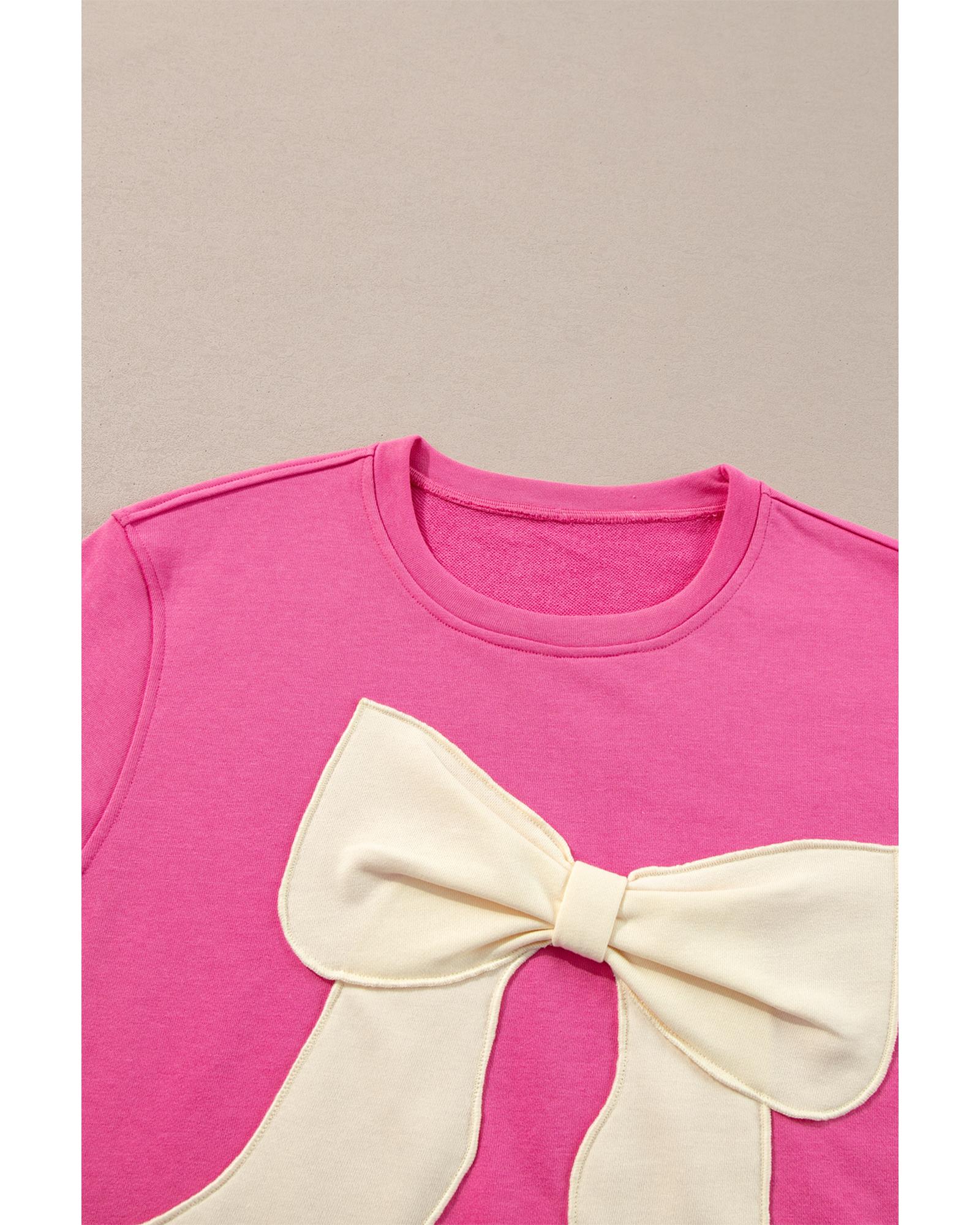 Strawberry Pink Contrasting Color Ribbon Bow Front Patch Loose Tee with Slits – S