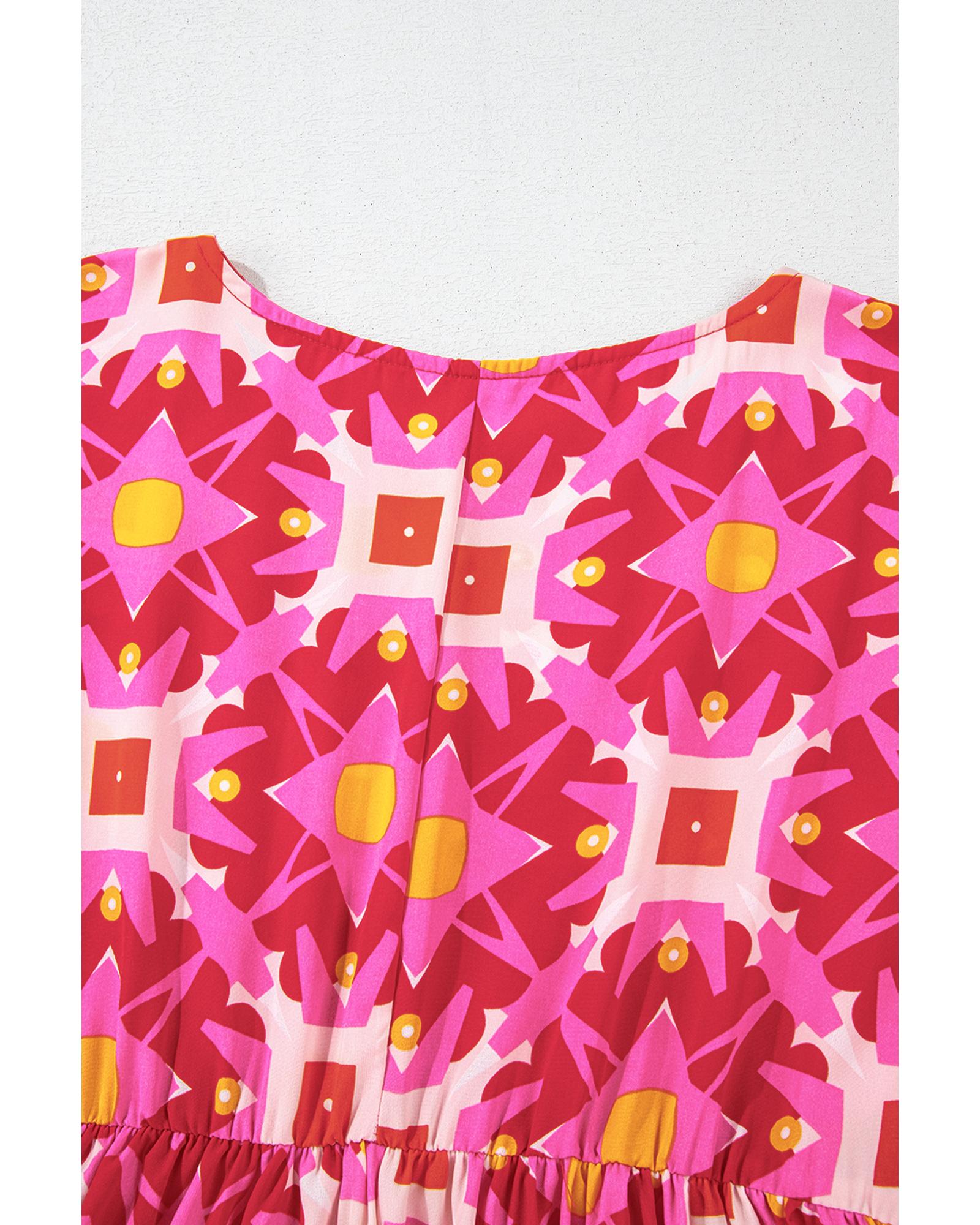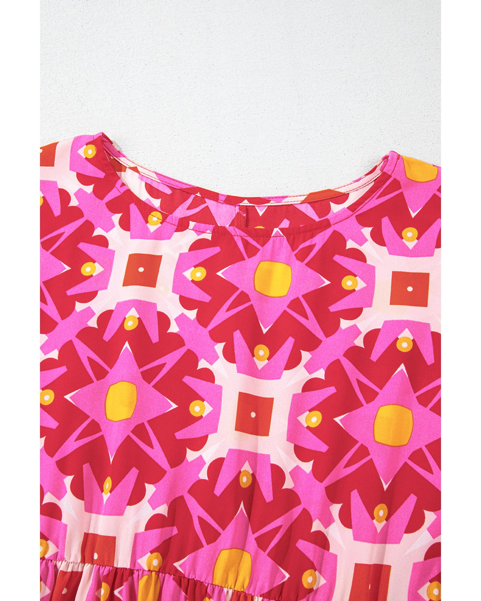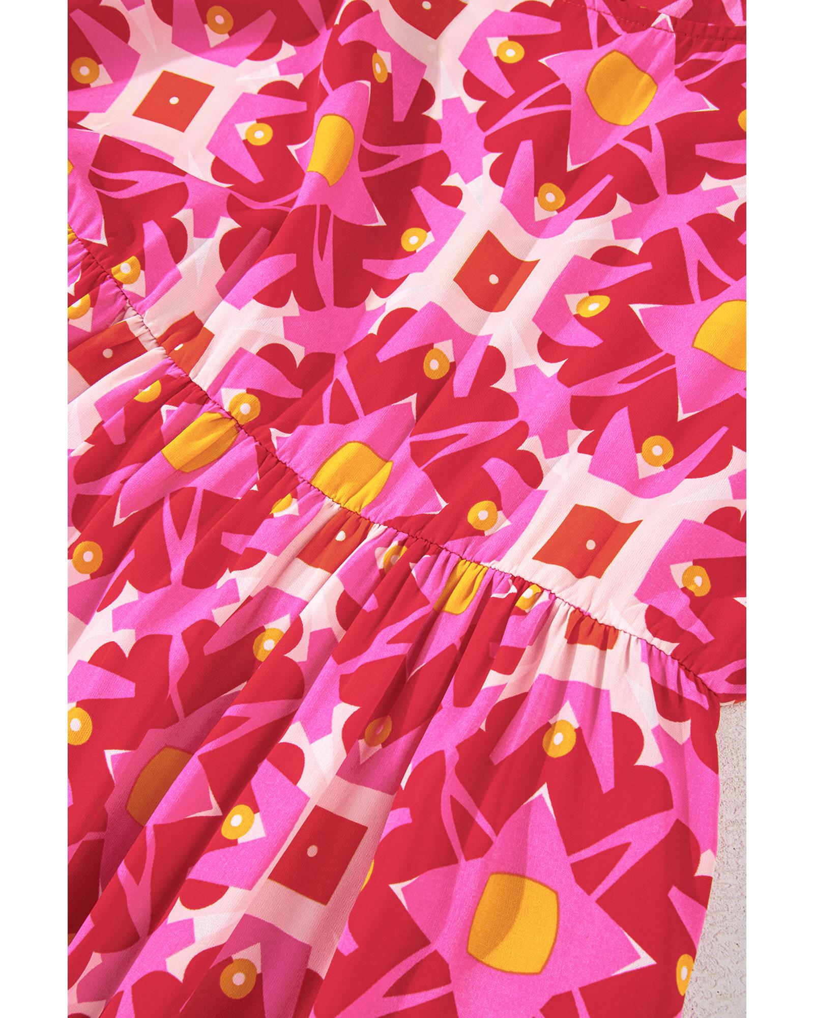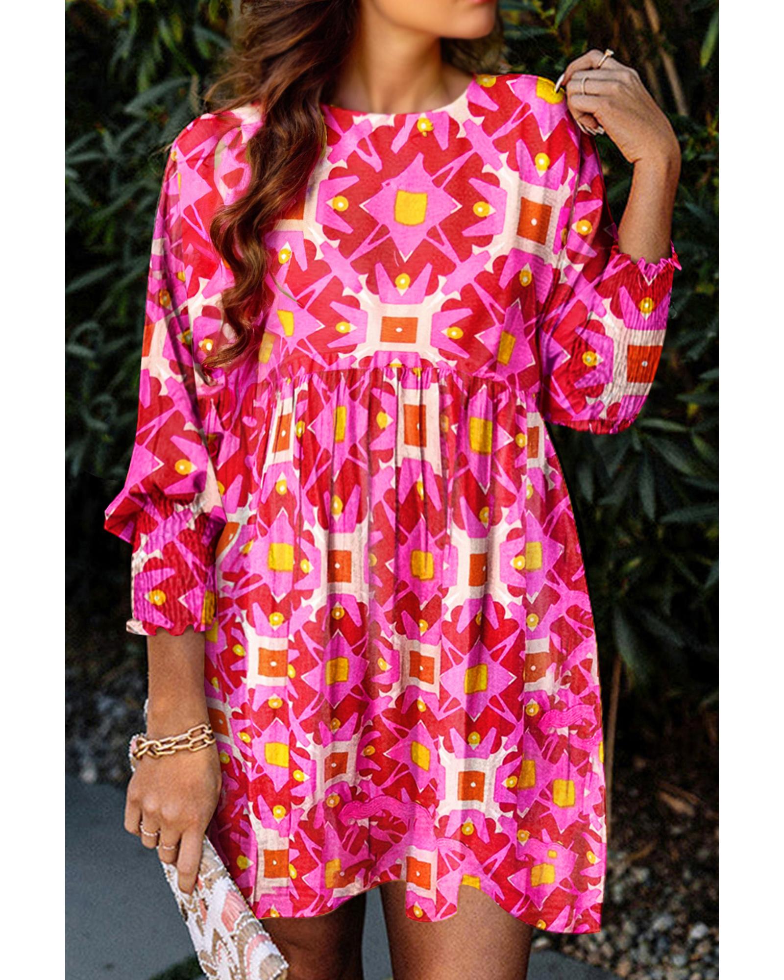 - Strawberry Pink Geometric Print Smocked Long Sleeve Mini Dress
