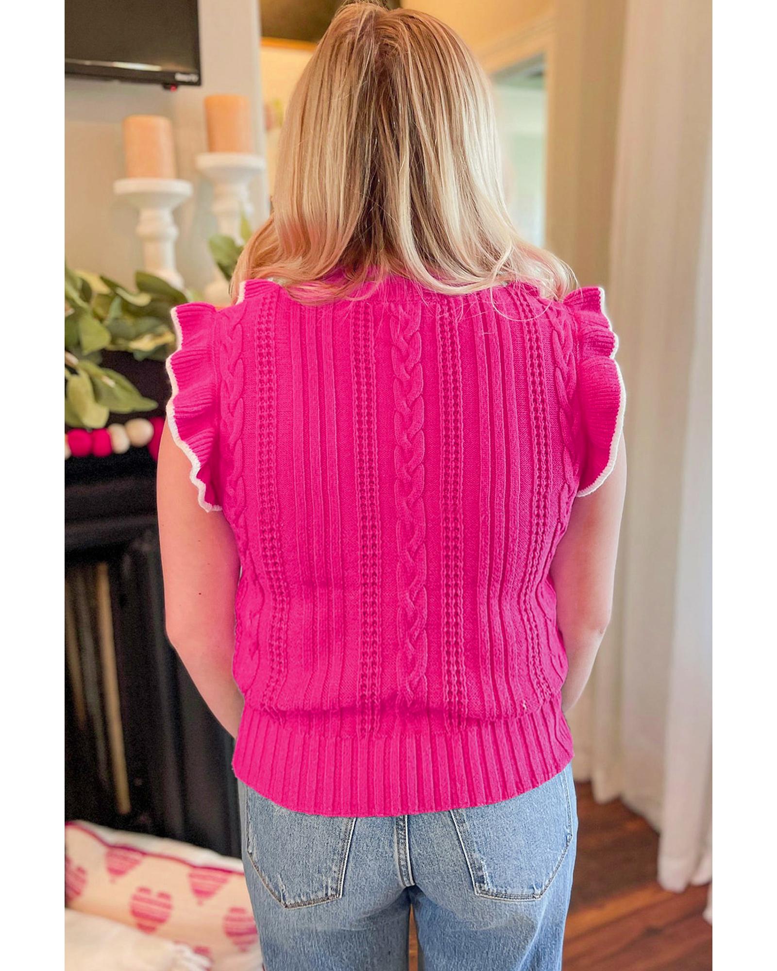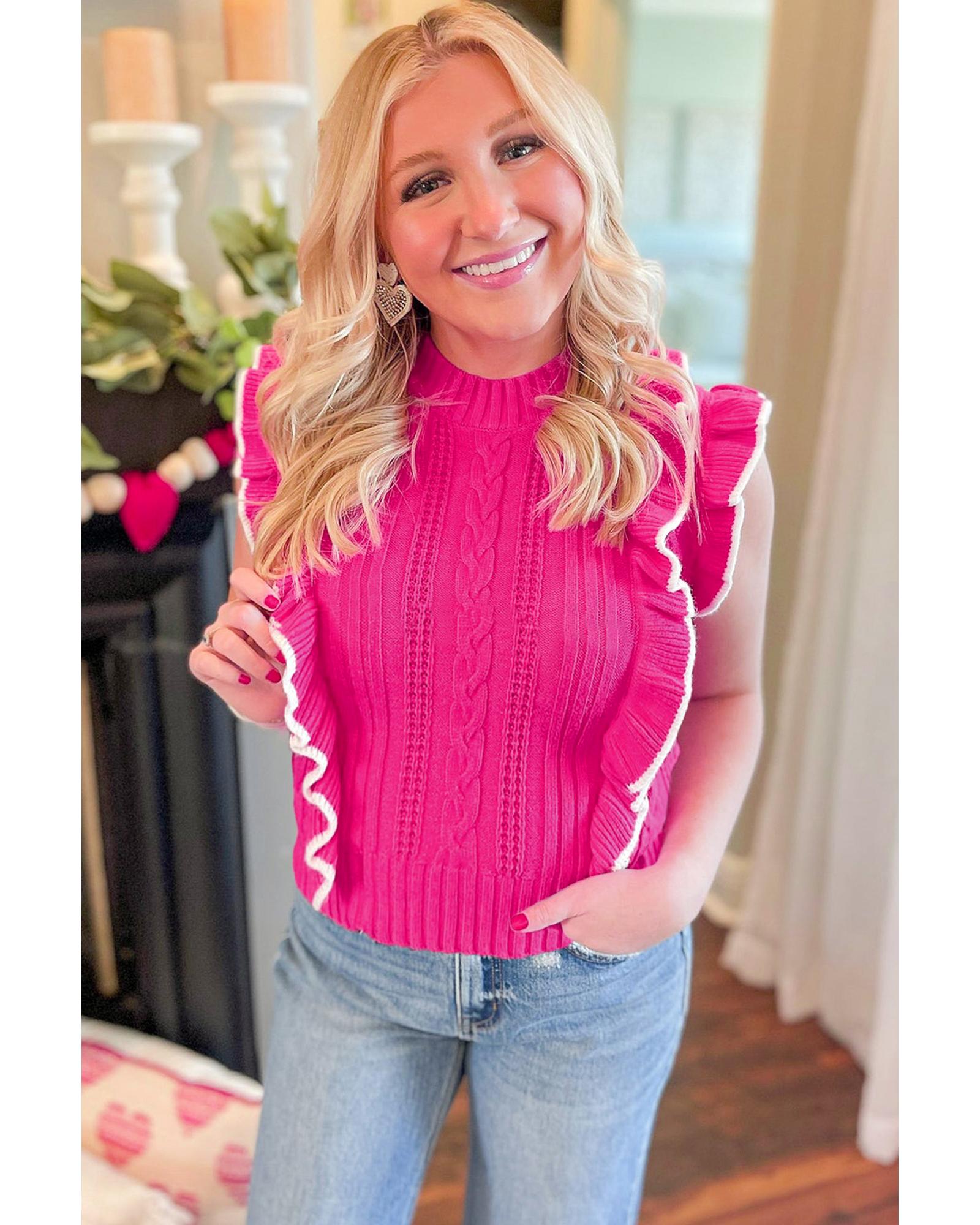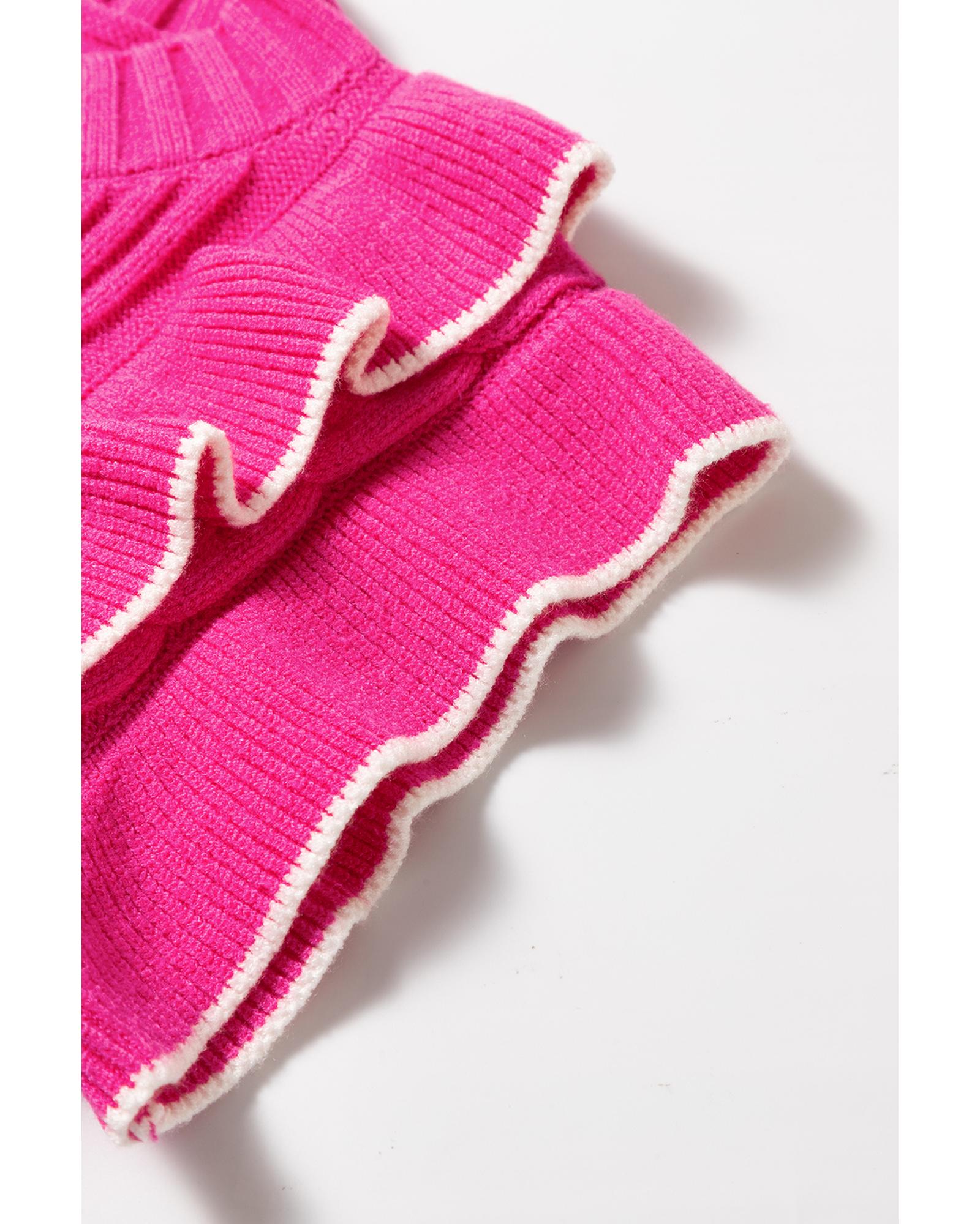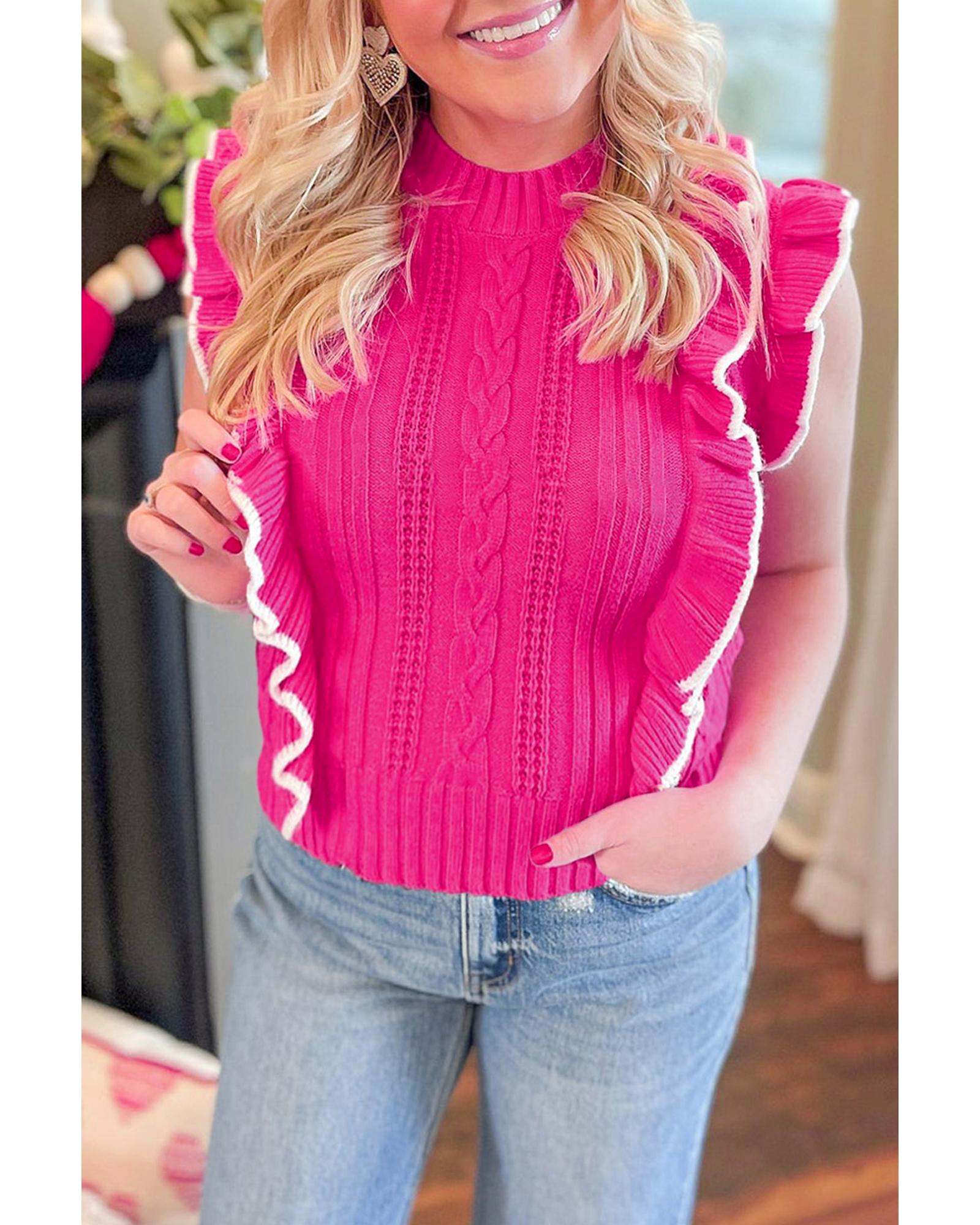 • Strawberry Pink Textured Knit Ruffled Mock Neck Sweater Tank