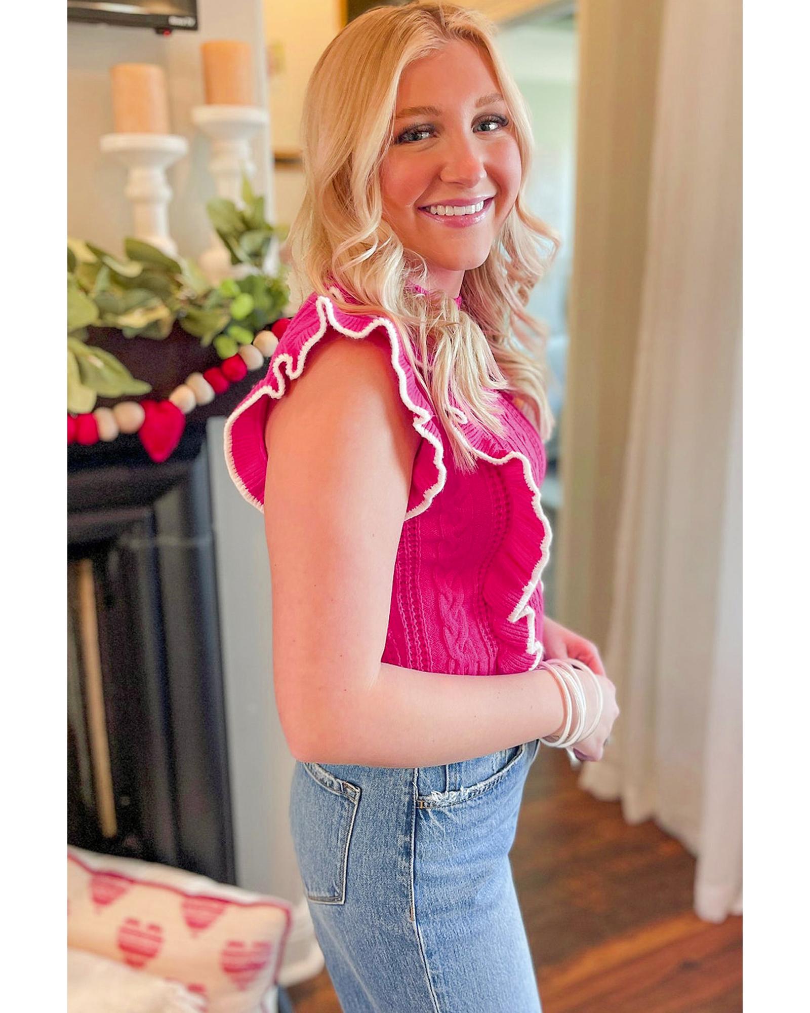 - Strawberry Pink Textured Knit Ruffled Mock Neck Sweater Tank