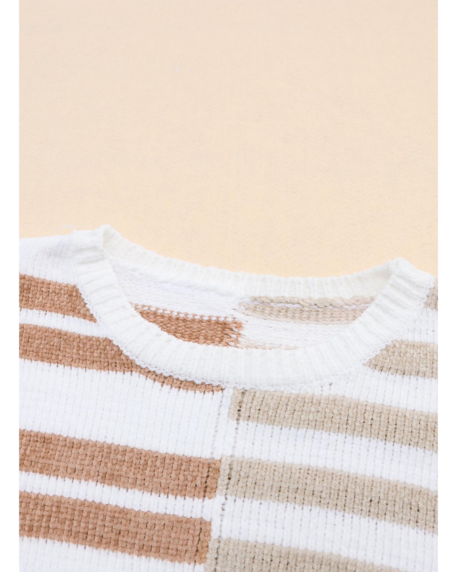 - Super fun knit sweater with multi colors in the stripe and a fun blocking pattern
