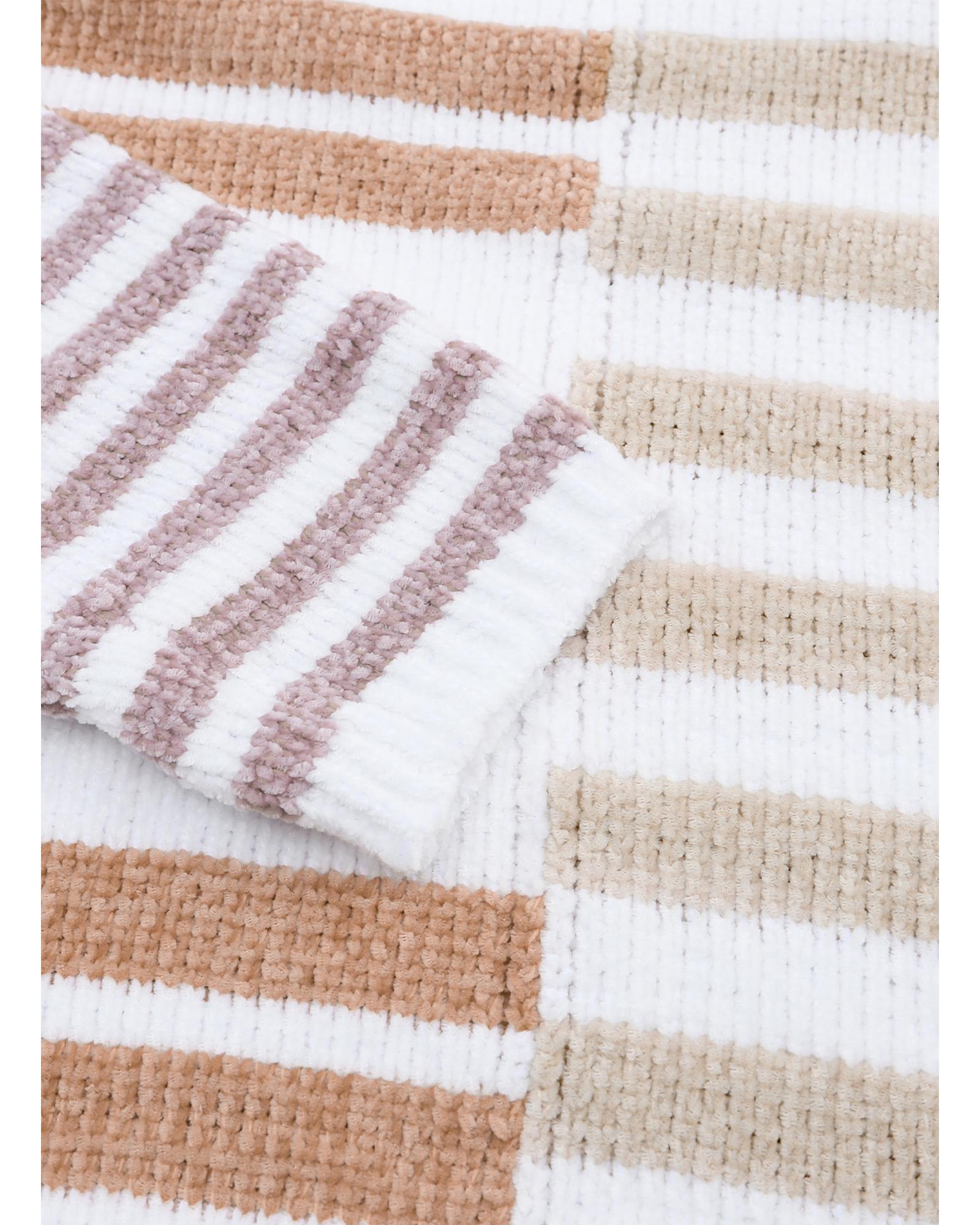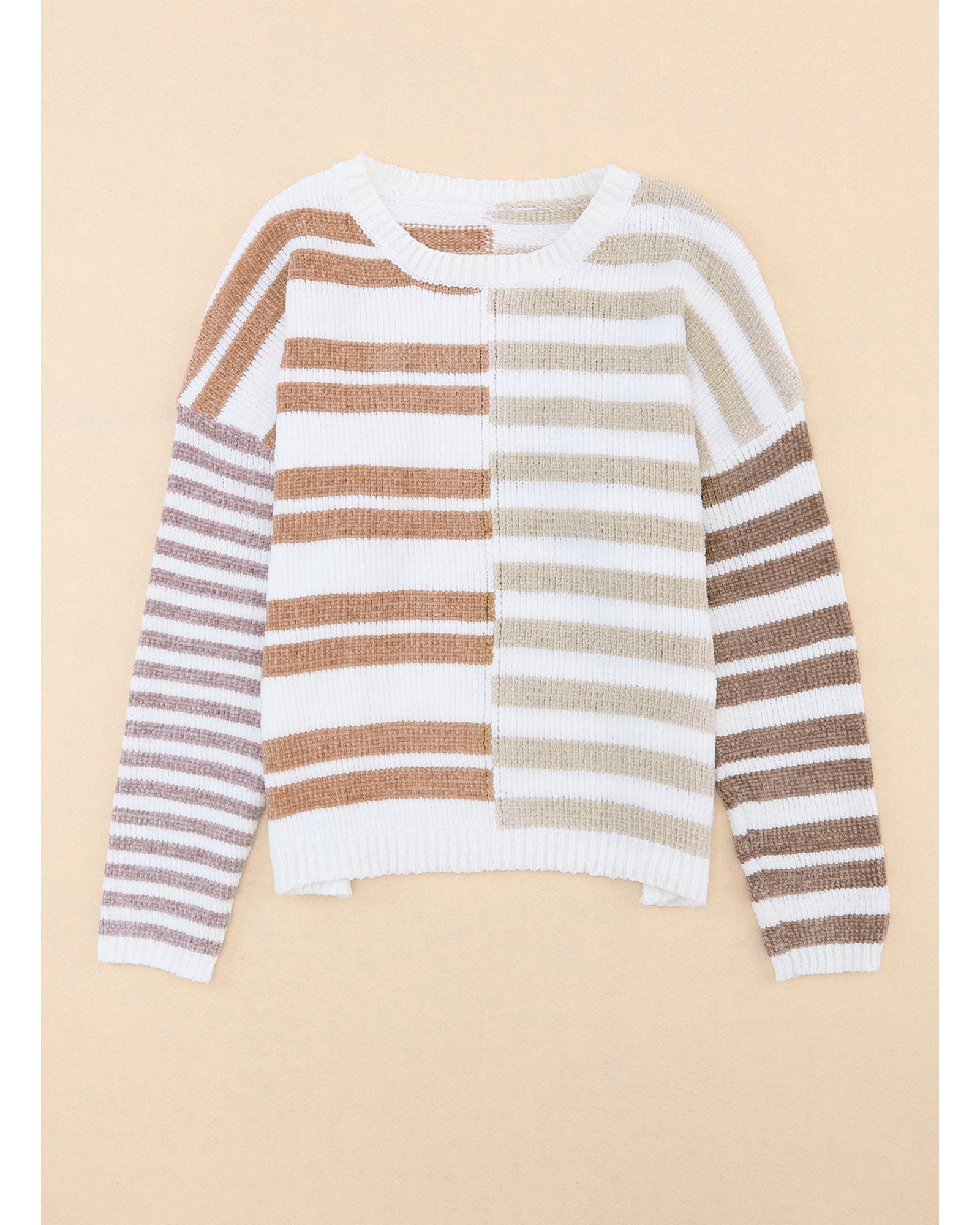 - Super fun knit sweater with multi colors in the stripe and a fun blocking pattern