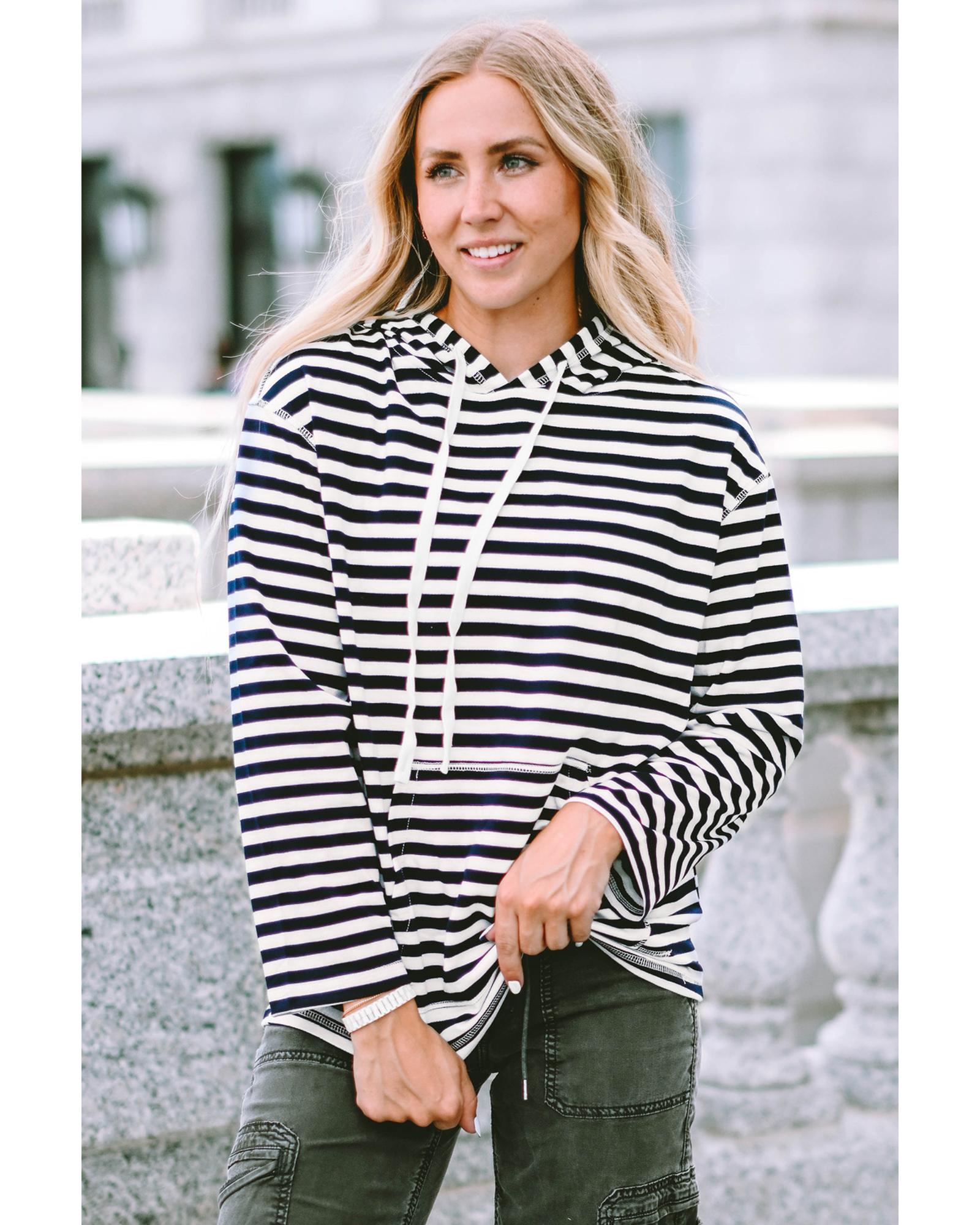 Trendy drawstring hoodie for spring and autumn Simple striped print for timeless style Kangaroo pocket for added design and functionality Well
