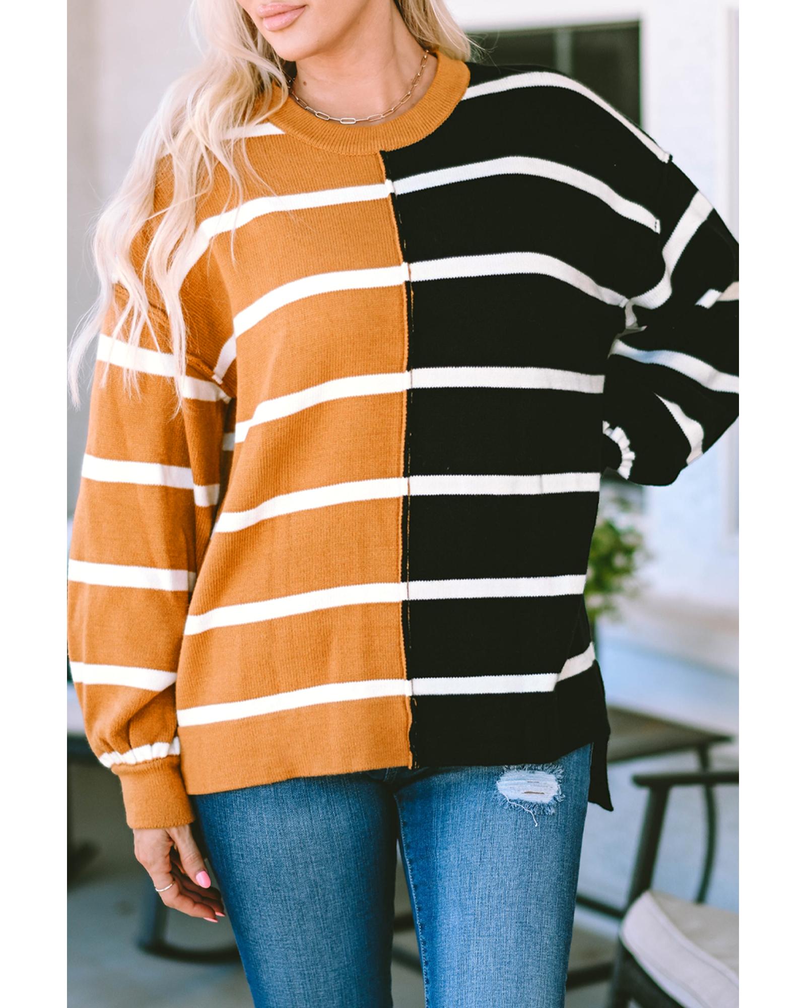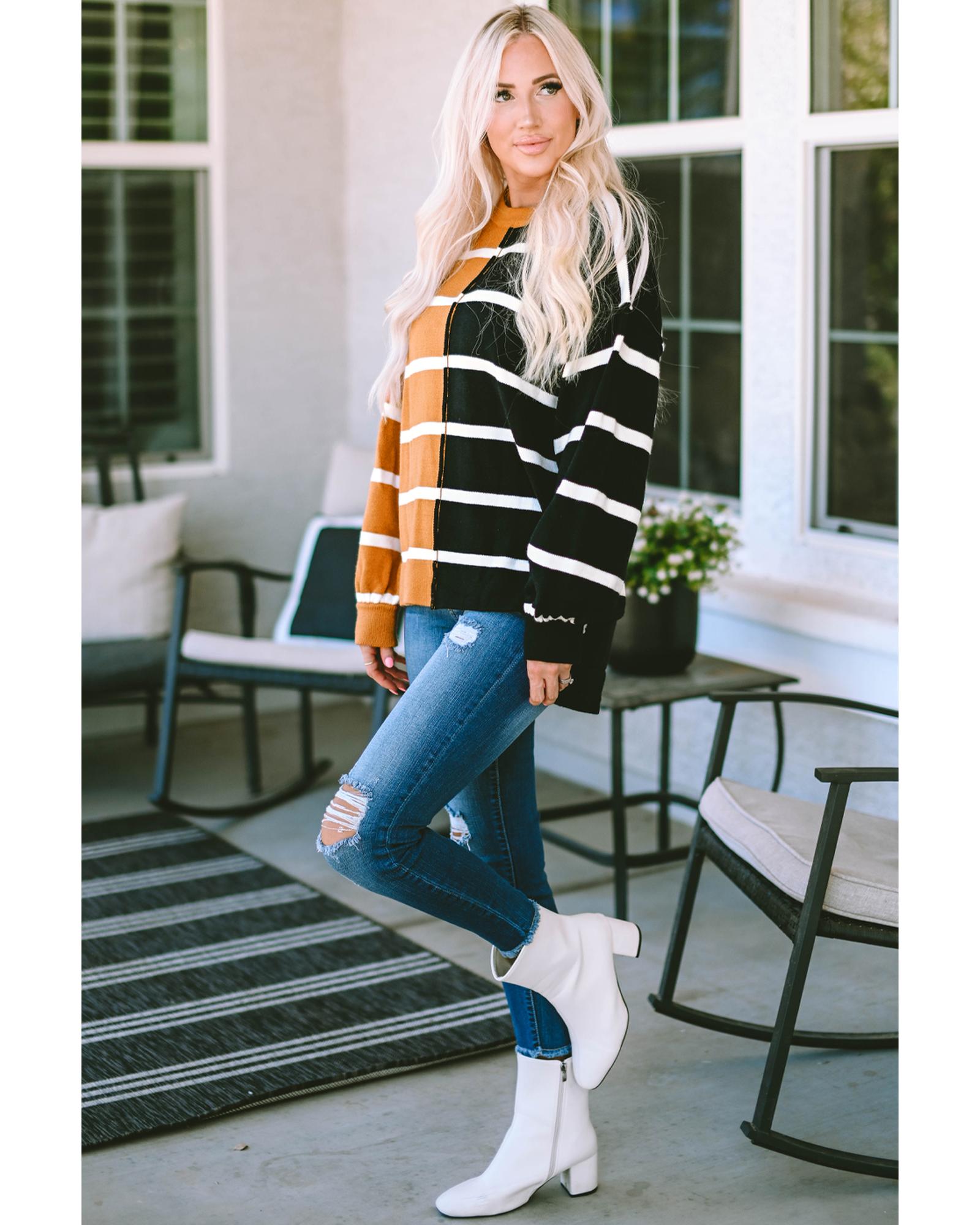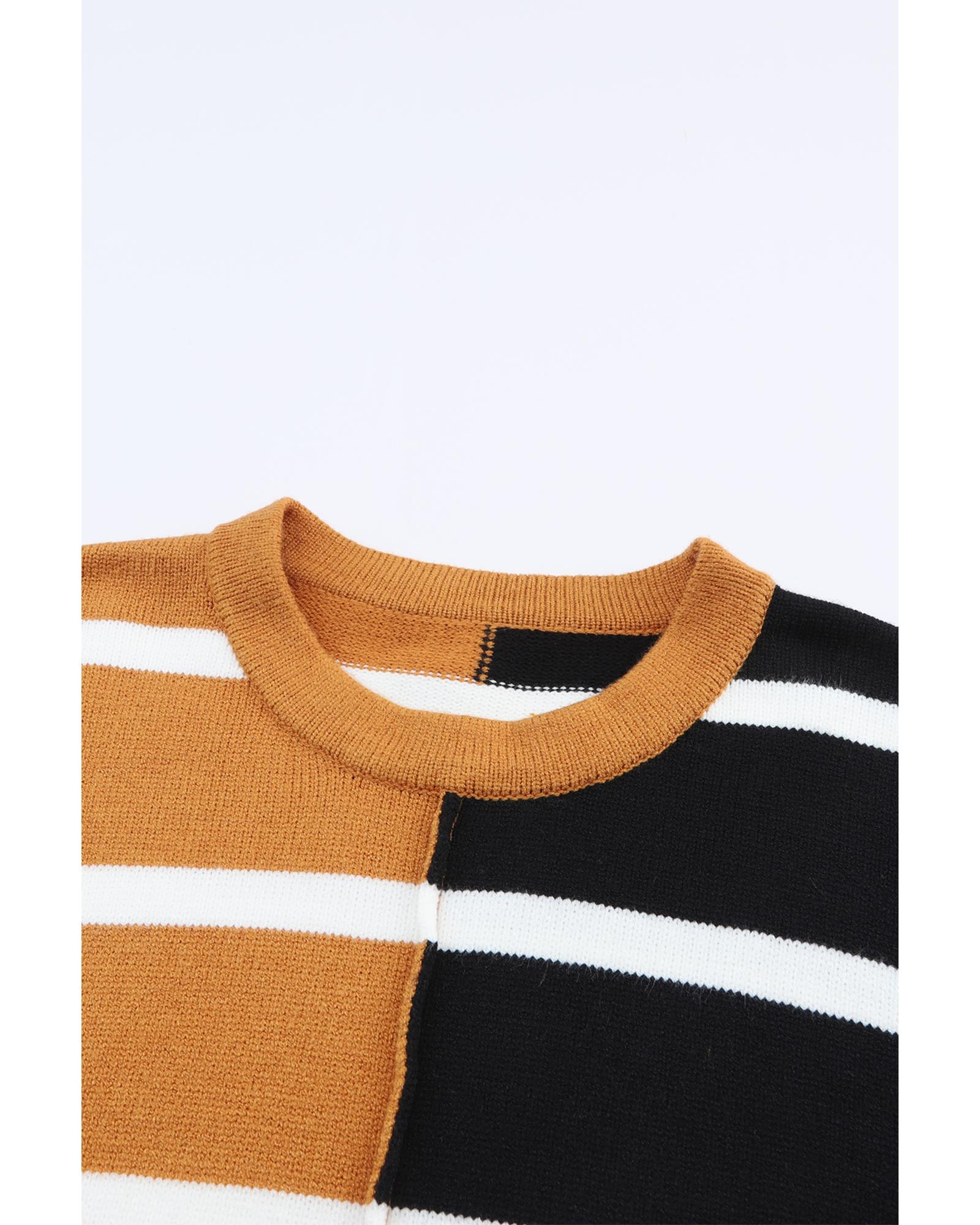 Classic crew neckline for a timeless look Dropped shoulder design for a relaxed silhouette Contrasting striped patchwork for a modern and eye - catching element Allows for easy movement and all