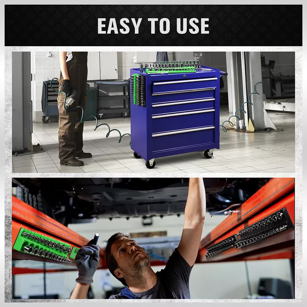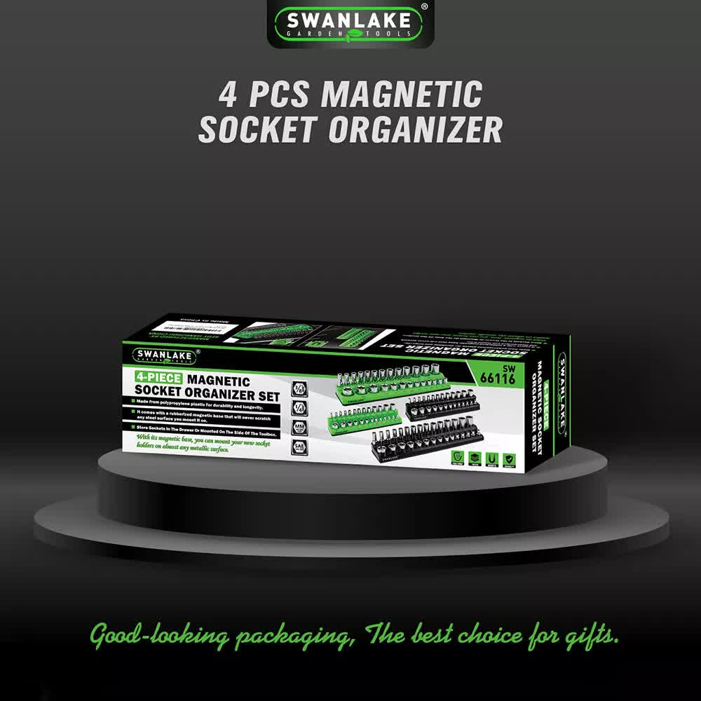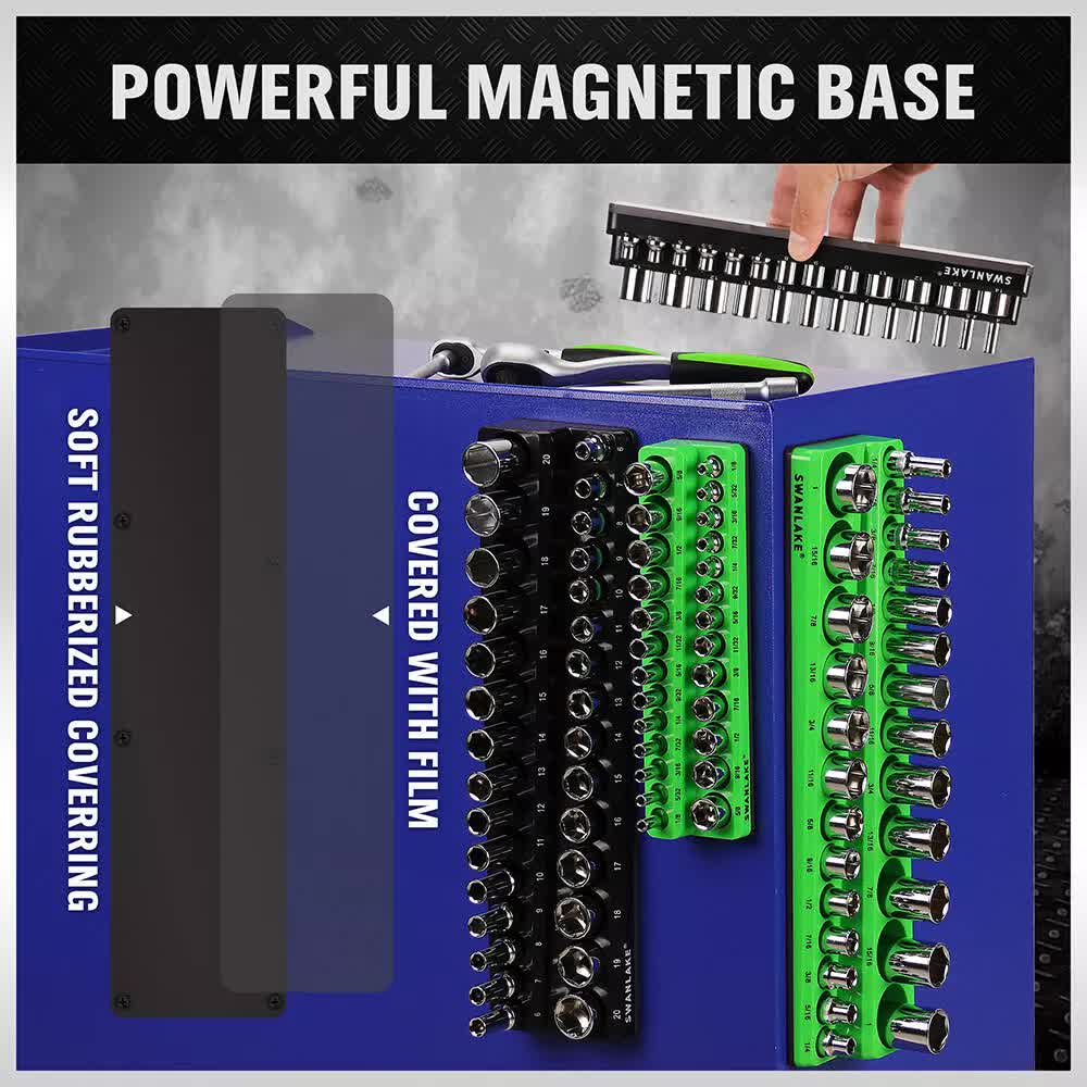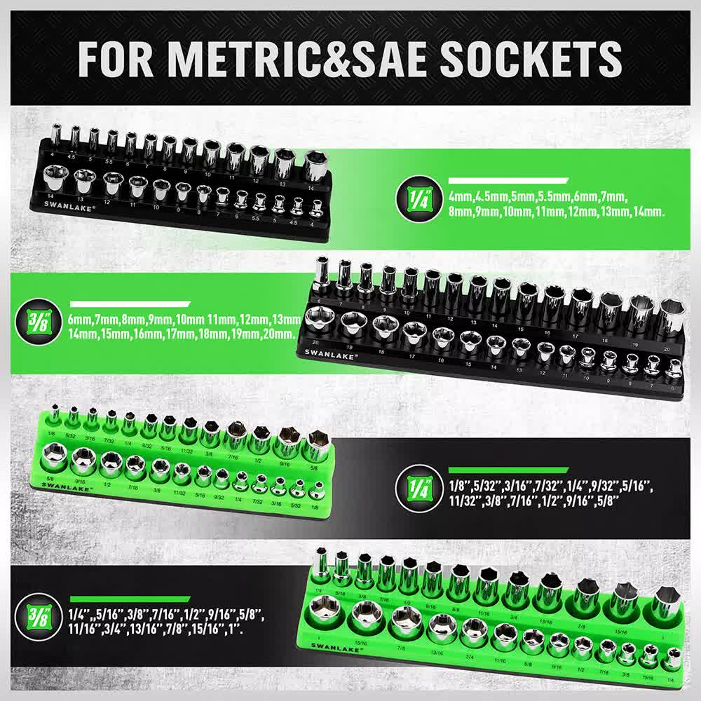 Includes 2pcs black metric magnetic socket organizers and 2pcs green SAE magnetic socket organizers for 1/4″, 3/8″ drives.