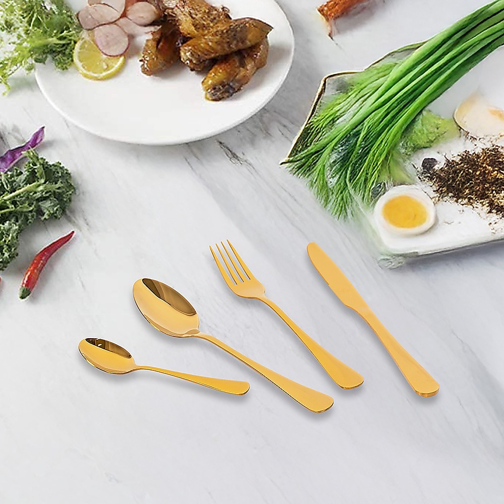 - Lustrous stainless steel cutlery with a golden color polished to a high sheen