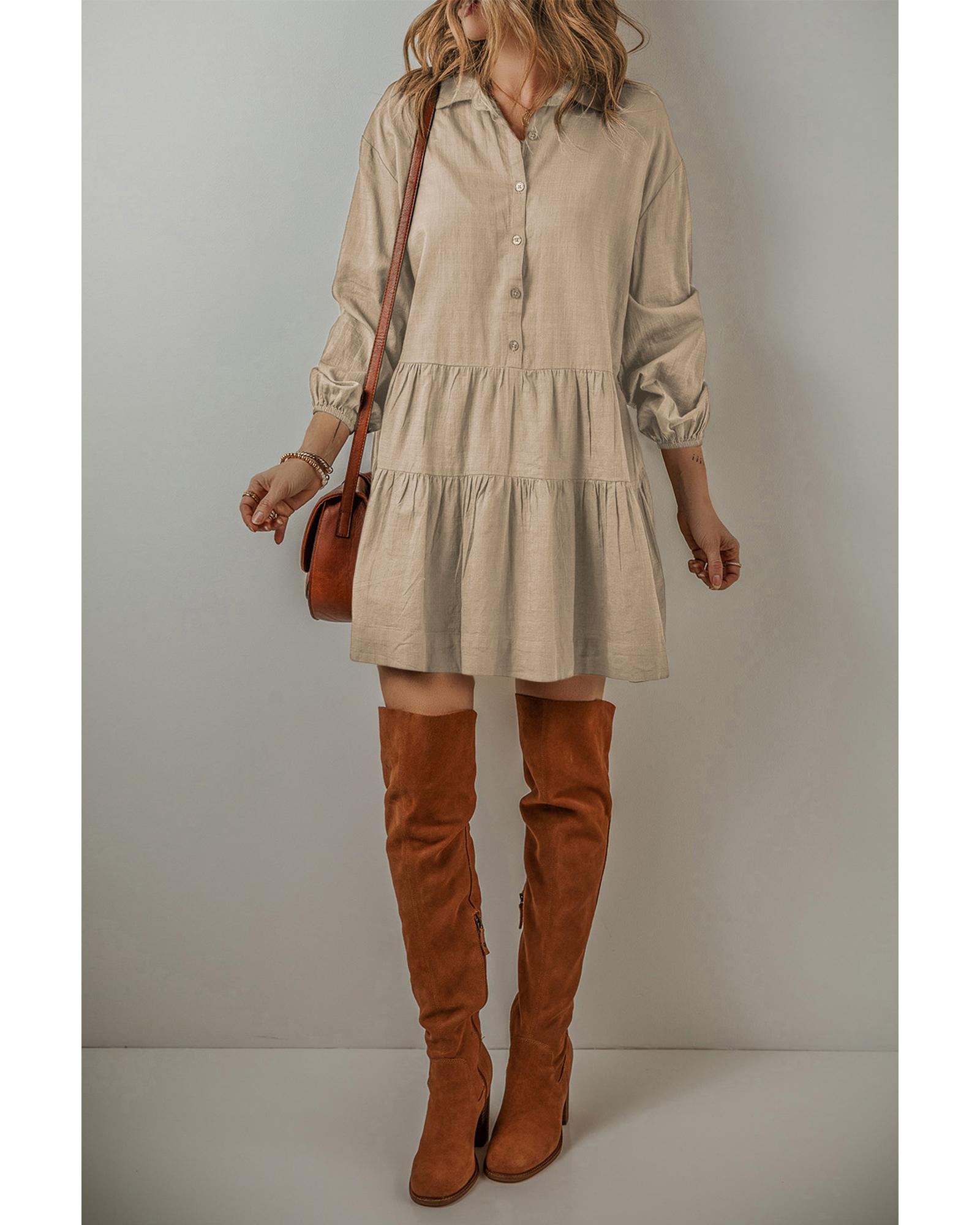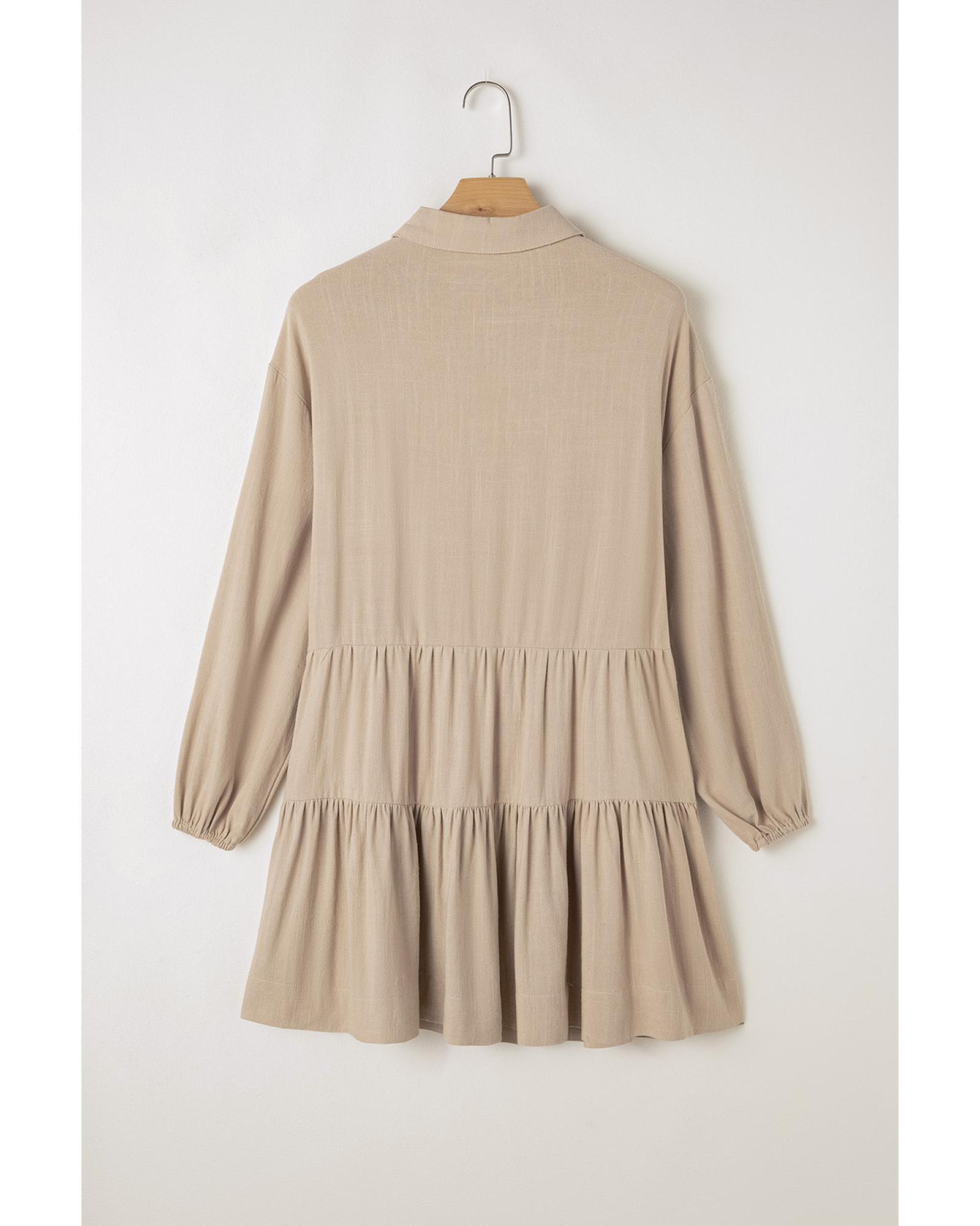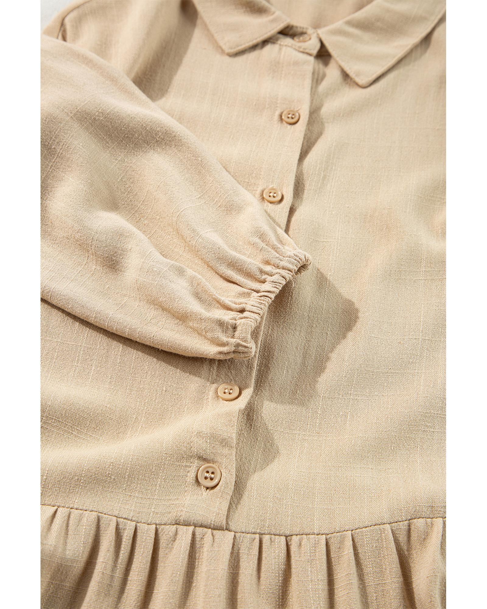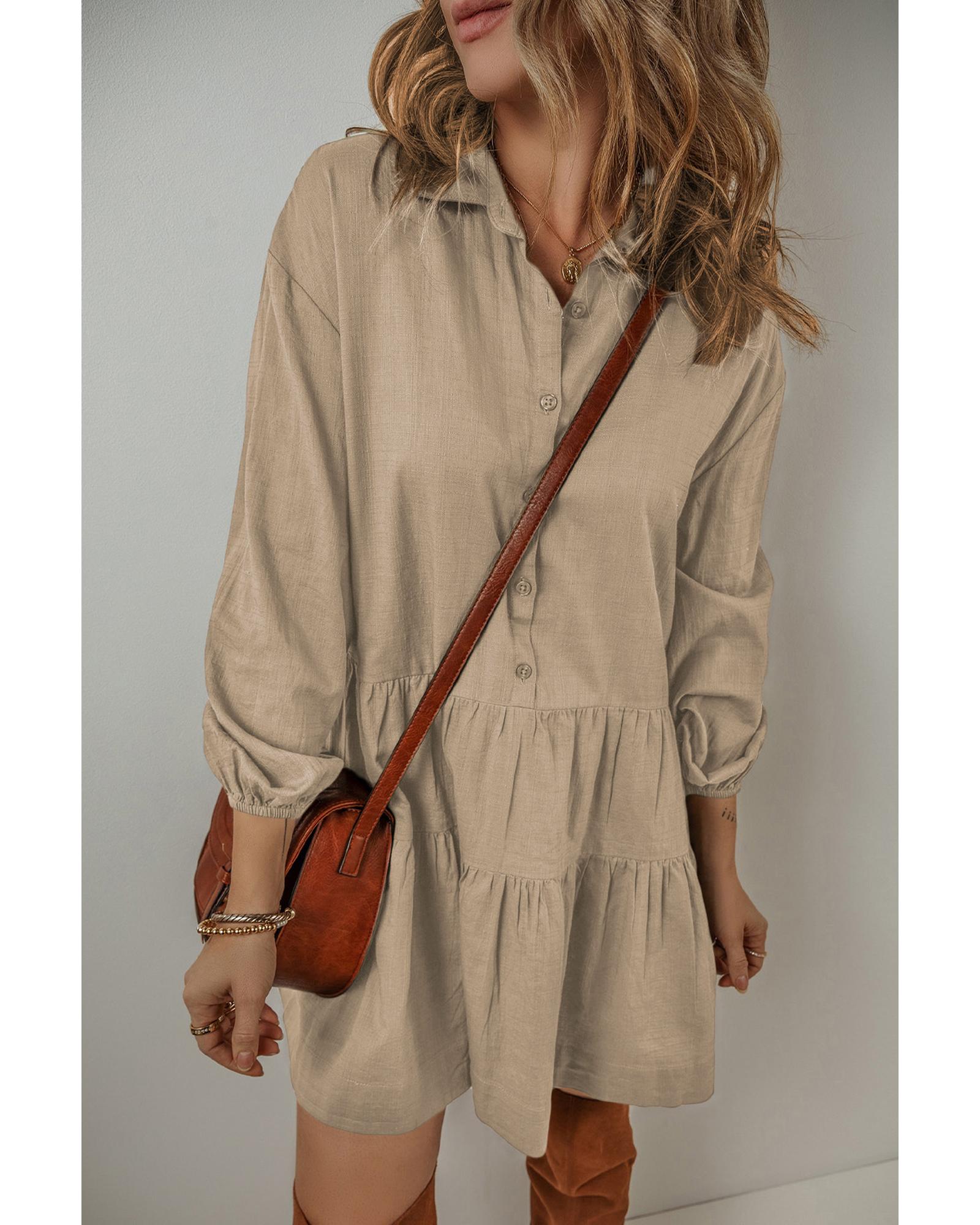 Tan Puff Sleeve Buttoned Tiered Pleated Shirt Mini Dress – L