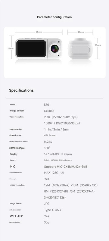 Unleash your creativity and capture life’s moments hands-free with our Thumb-Sized 2.7K Camera. This incredibly compact camera weighs a mere 35.6g and can easily attach to your clothing or accessories using its strong magnetic mount. It boasts a 180-degree rotatable lens, allowing for versatile shooting angles, whether it’s first-person point of view or a creative third-person perspective. Record in crisp 2.7K video or capture high-resolution still images (12MP/8MP/5MP/3MP options available). The 1.47-inch high-definition display allows you to see what you’re recording in real-time. The camera supports loop recording (1min/3min/5min segments), H.264 video encoding, WiFi connectivity for app control, and expandable storage up to 128GB (microSD card required, not included). It features an internal 350mAh battery offering substantial usage time. This camera unlocks super creative viewpoints for expressing yourself through life and motion.