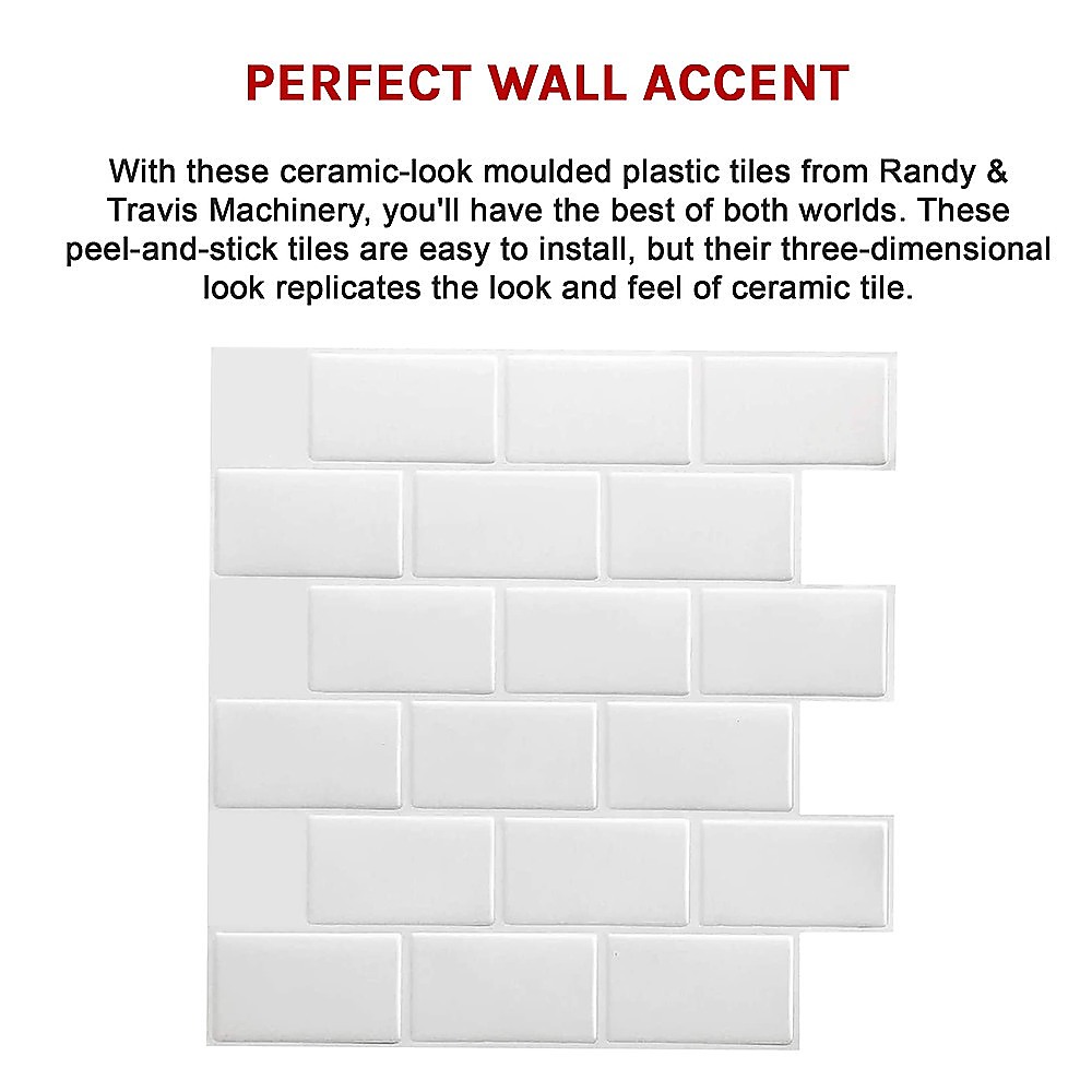 Want the look of expensive subway tile but don't want the hassle of installing it? With these ceramic-look moulded plastic tiles from Randy Travis Machinery, you'll have the best of both worlds. These peel-and-stick tiles are easy to install, but their three-dimensional look replicates the look and feel of ceramic tile. They're perfect for an accent wall, backsplashes for kitchens or bathroom sinks, on your kitchen island or even for your caravan.