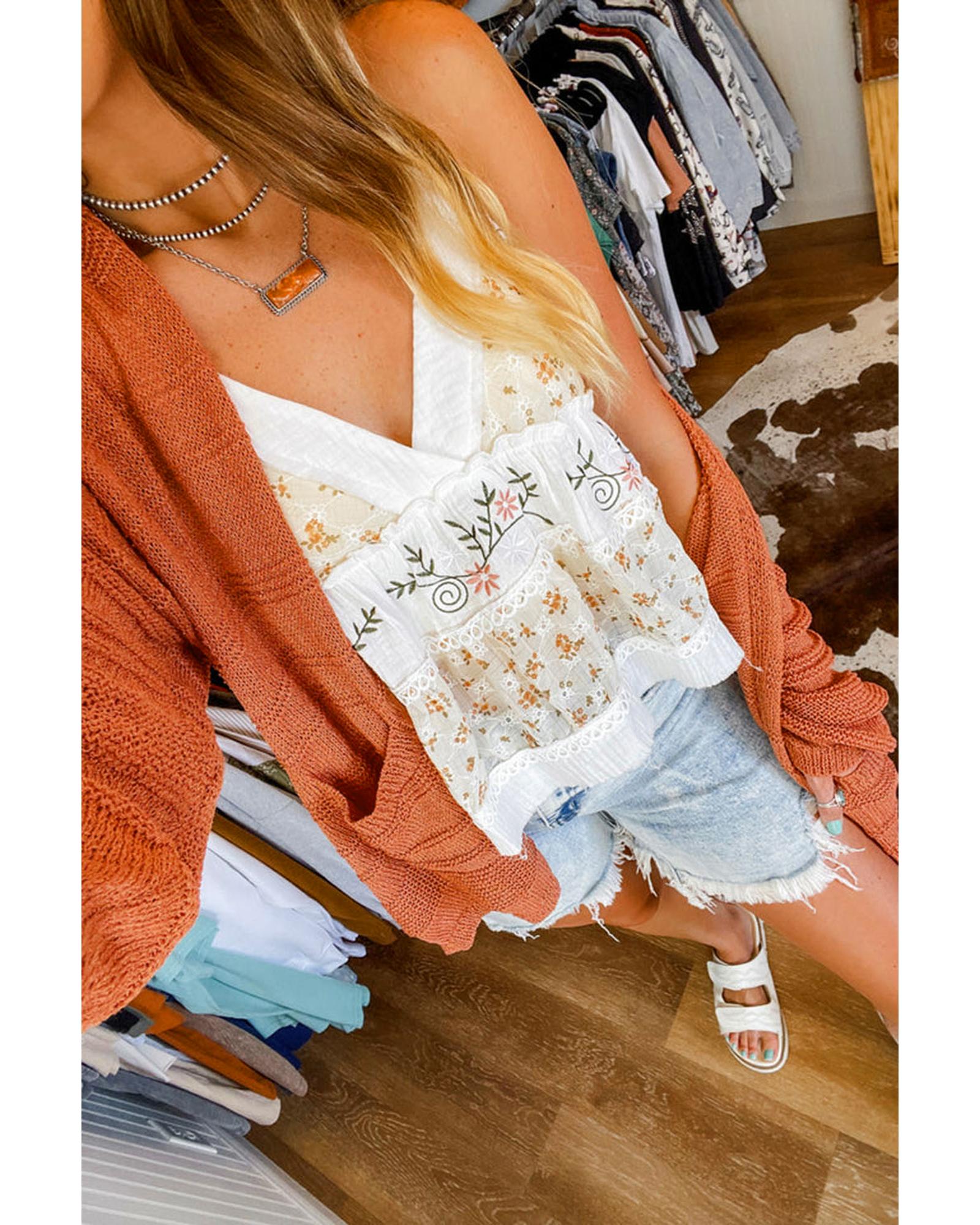 Tomato Red Open Front Textured Knit Cardigan with Pockets – L