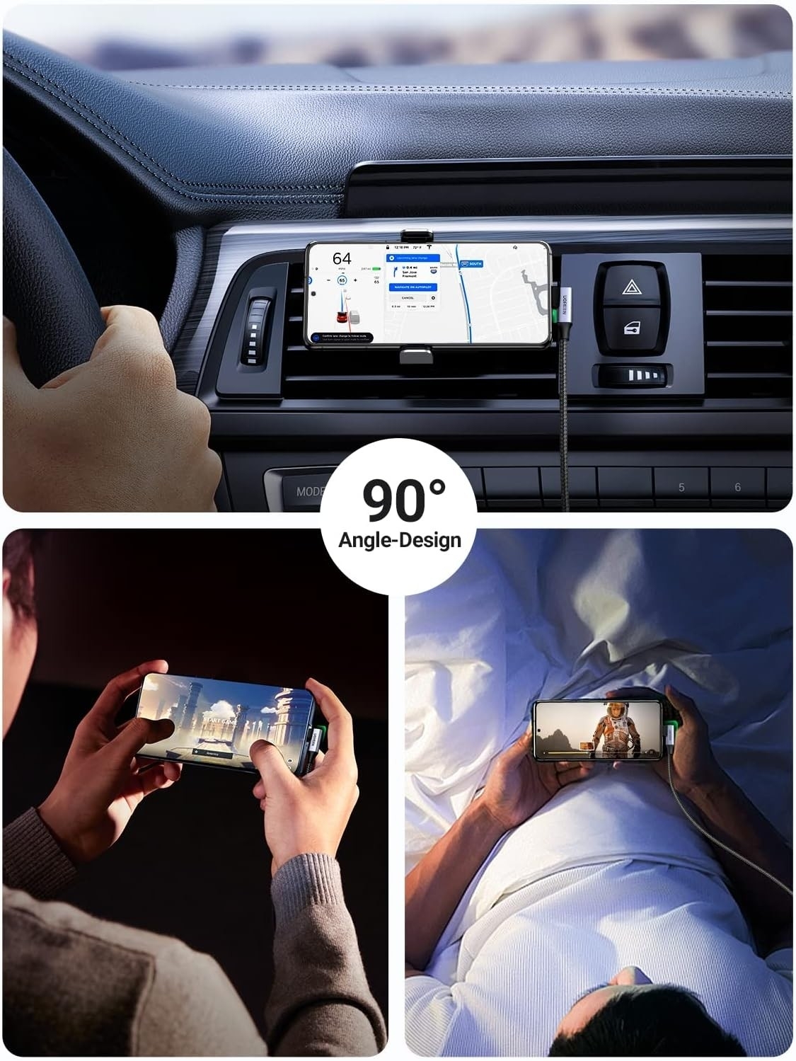 This USB A to USB C fast charging cable with an innovative 90 degrees L design. Reduce the use of bent cables, protect equipment interfaces, and extend service life. It is more convenient to play games and watch videos while charging.