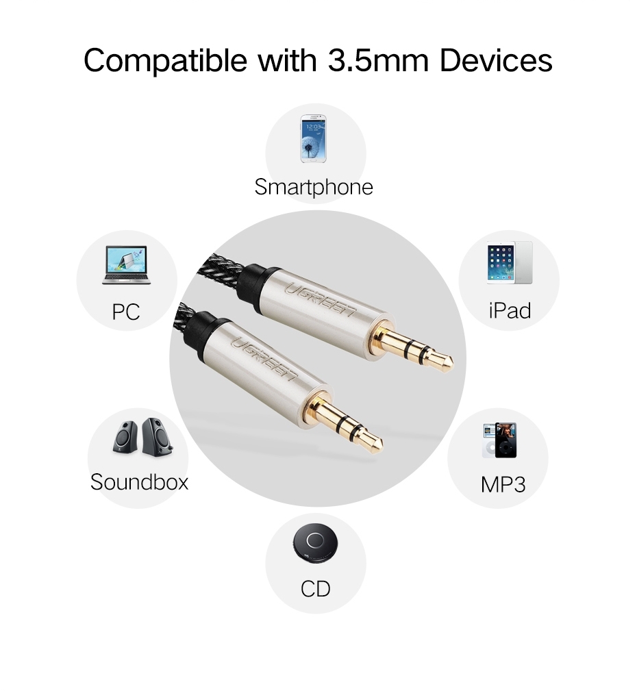 • Premium quality metal connectors: straight head Stereo jack 3.5 mm male to male.