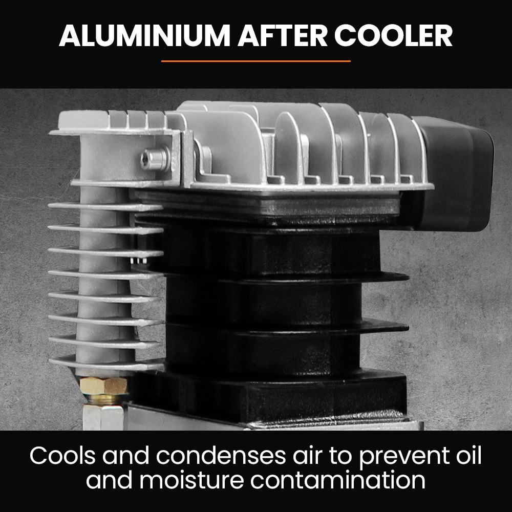 The heart of this machine is a robust cast iron parallel twin-cylinder compressor with aluminium pistons. The aluminium after-cooler is assisted by a fan integrated into the drive pulley. The cooler air output contributes to the compressor’s overall efficiency and performance. The aftercooler helps ensure that less moisture ends up in your air hose protecting your tools from damaging moisture. The unit also features a pump speed of 950 rpm and a duty cycle of 0.75, ensuring consistent and reliable performance. The pump has an outstanding air displacement of 370L/Min (13.0 CFM), giving it powerful air delivery for demanding applications.