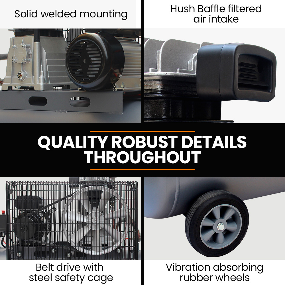 The vertical tank design saves space. It takes less floor space making it a smart solution in smaller shops and garages. The large 100L capacity steel tank ensures extended run times. The durable tank construction is built to withstand rigorous use, and the welded cast steel cylinder chamber has welded outlet and inlet ports and a welded moisture bleed port with an easy-to-use quarter-turn valve