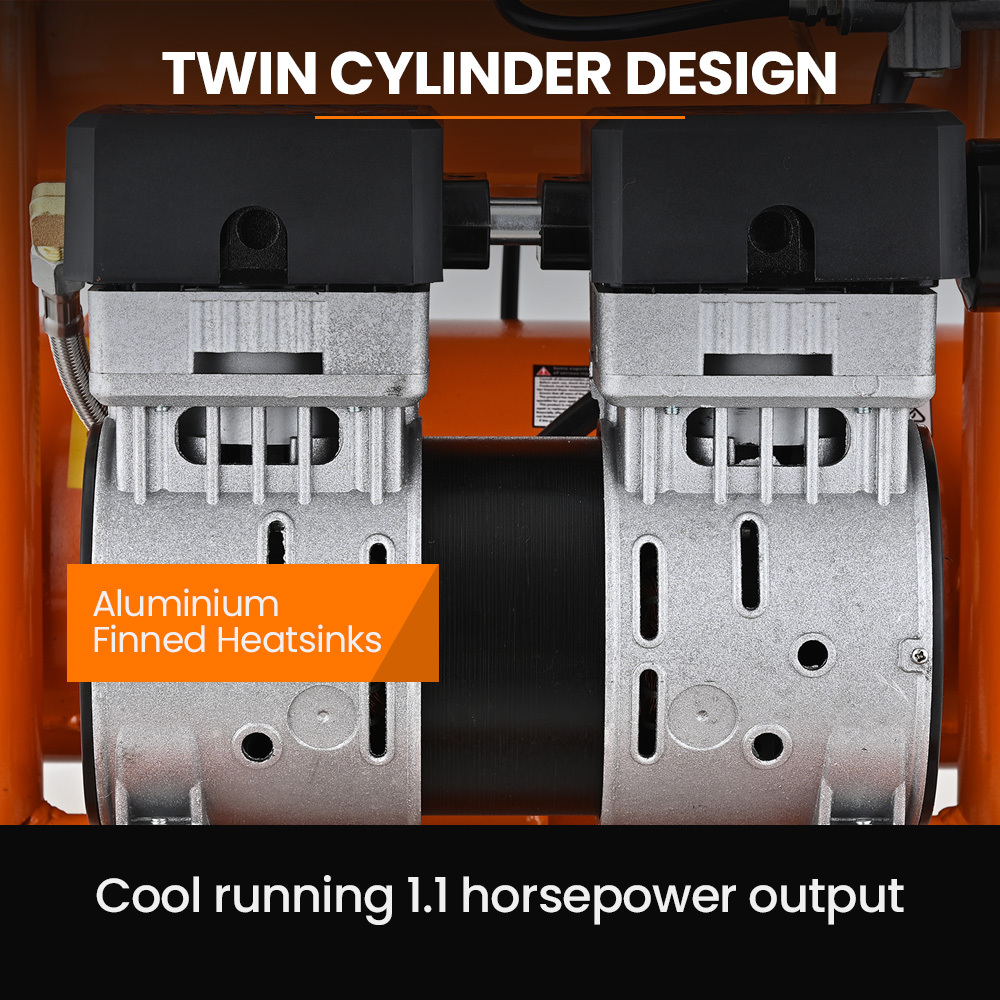 This air compressor has a 1.1hp twin-cylinder motor. The 2850 RPM motor is more than twice as fast as our competitors. It has fan-forced cooling and aluminium heatsinks that keep this high-performance motor running cool.