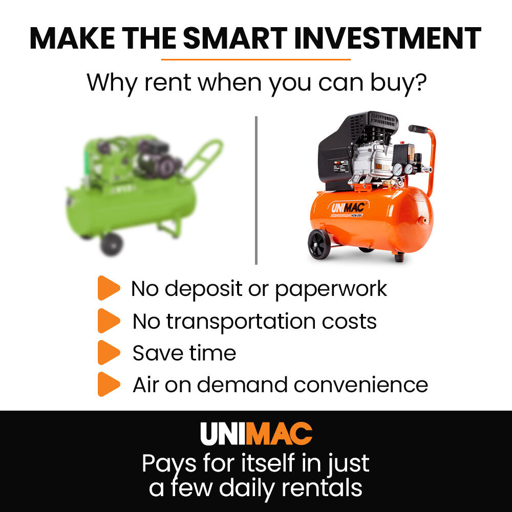 The Unimac ACM-250 Direct Drive Air Compressor is designed for tradies and DIYers who don’t mess around. This unit packs the grunt and reliability you need when the pressure’s on.