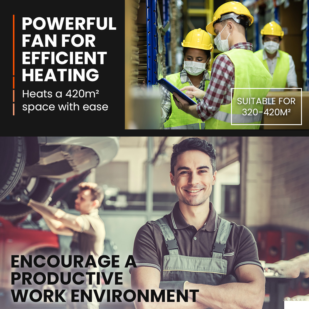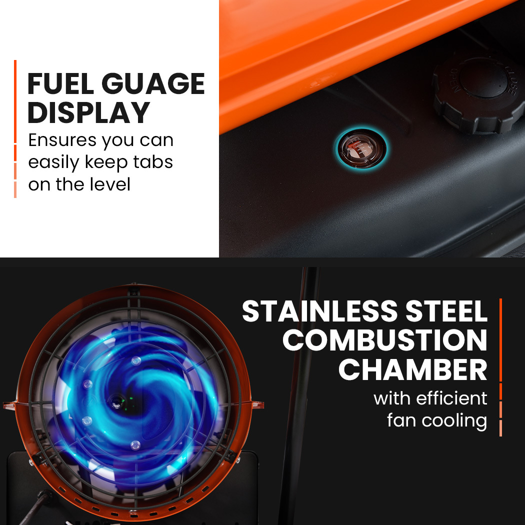 Importantly, this Portable Blow Heater is an exceedingly safe unit to have functioning in busy environments. It has built-in features which protect against overheating, flame-outs and electrical power breakdowns. Moreover, it operates on both Diesel and Kerosene fuel for greater versatility.