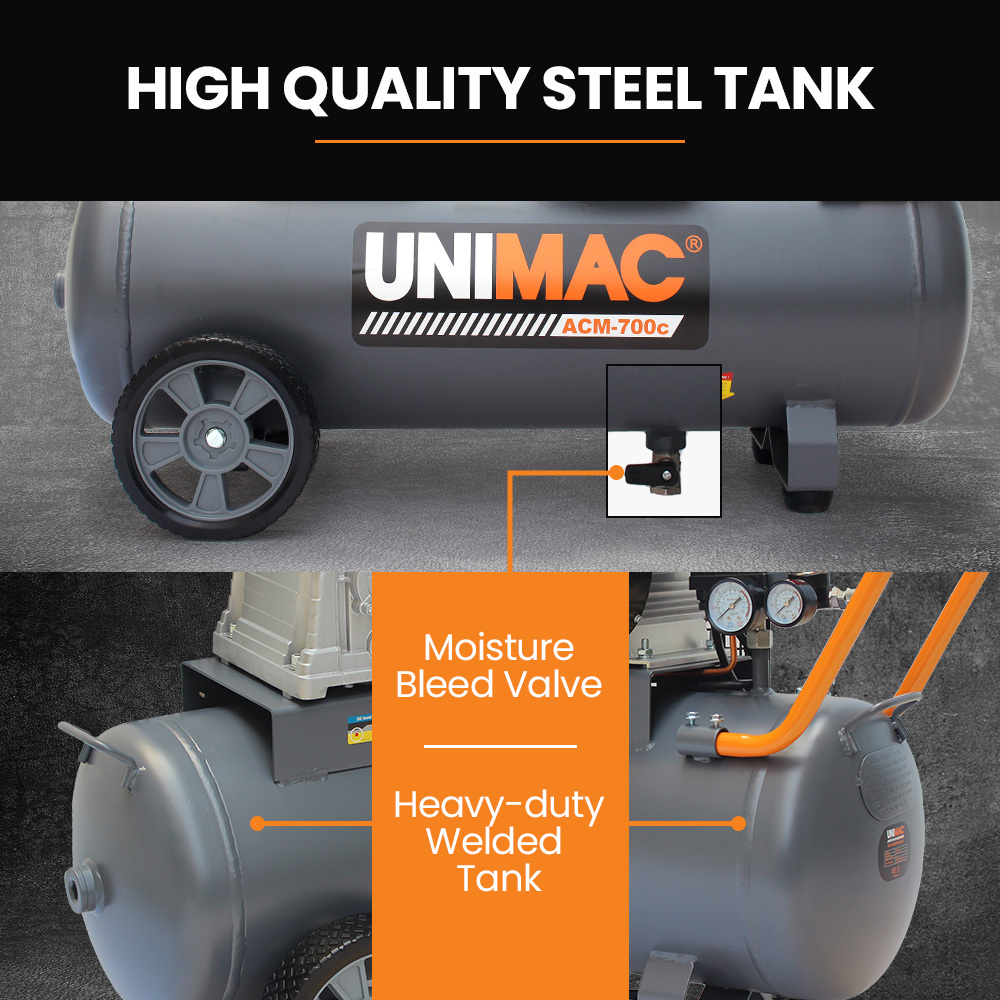 The Unimac ACM-700c Belt Driven Air Compressor combines strength, durability, and efficiency to meet the needs of professionals and serious DIYers.