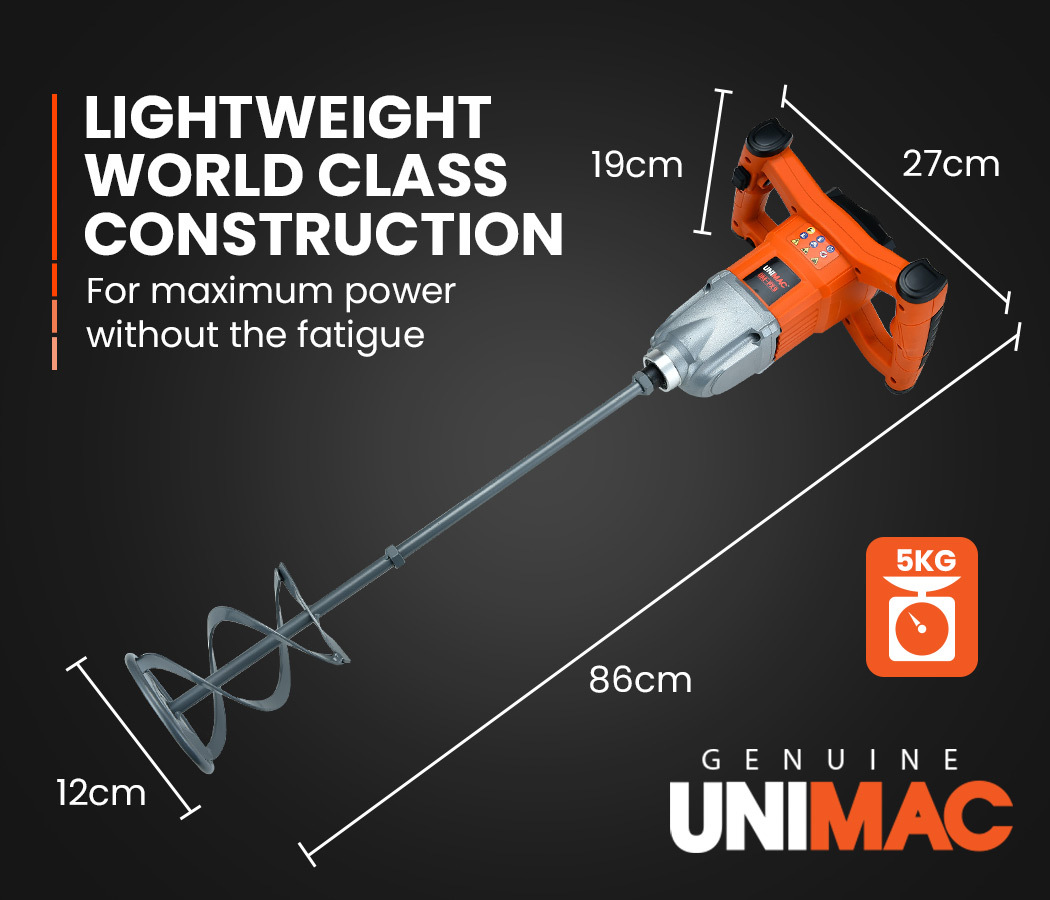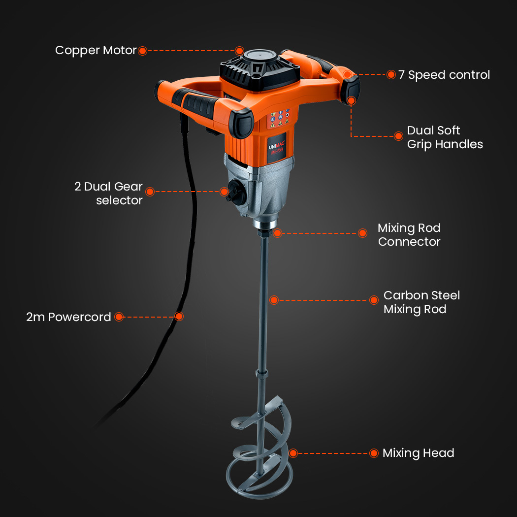 The UNIMAC UM-PX9 Electric Variable Speed Mixer is the ultimate multipurpose paddle stirrer for concrete, paint, mortar, plaster, grout, tile adhesive and other compounds. It’s suitable for both commercial use as well as the home handyman looking to save big dollars on DIY projects!