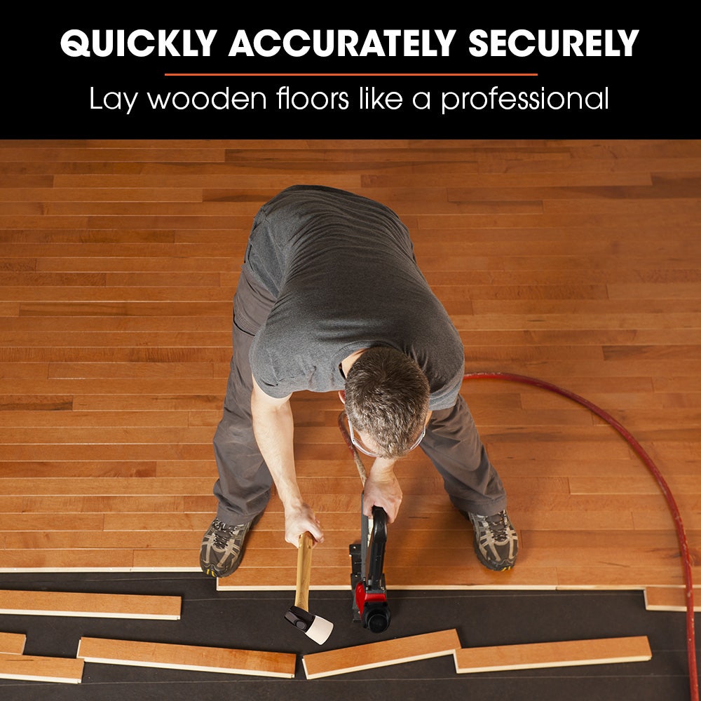 Super-lightweight and powerful, the pneumatic Unimac Nail Staple Gun will move in step with you, effortlessly driving 37-50mm nails and 25-50mm staples into both unfinished and pre-finished hardwood flooring at 48Nm. Its ergonomic extended handle makes for a comfortable working position. And it’s as easy on the floorboards as it is on your body, featuring a pre-finished floorboard adaptor foot for truly polished results. It has all the makings of a great performance.
