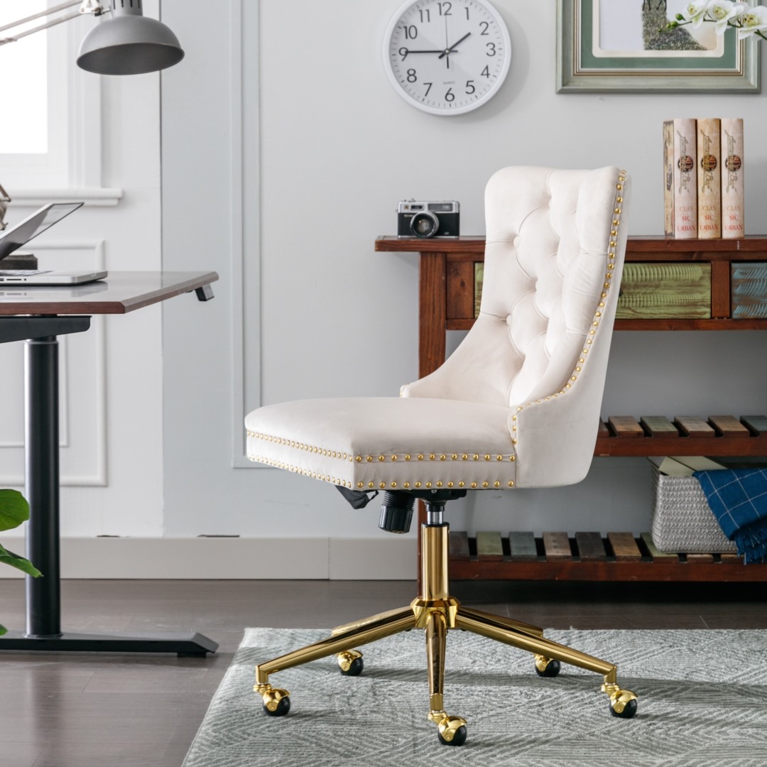 VERSATILE STYLISH: Featuring gold metal legs and studs trim, this contemporary office chair boasts an alluring appearance. The tufted backrest, adorned with diamond patterns, adds a touch of elegance. Whether placed in an office, study, living room, bedroom, dining room, dressing room, or vanity room, this chair is a perfect addition to enhance any space.