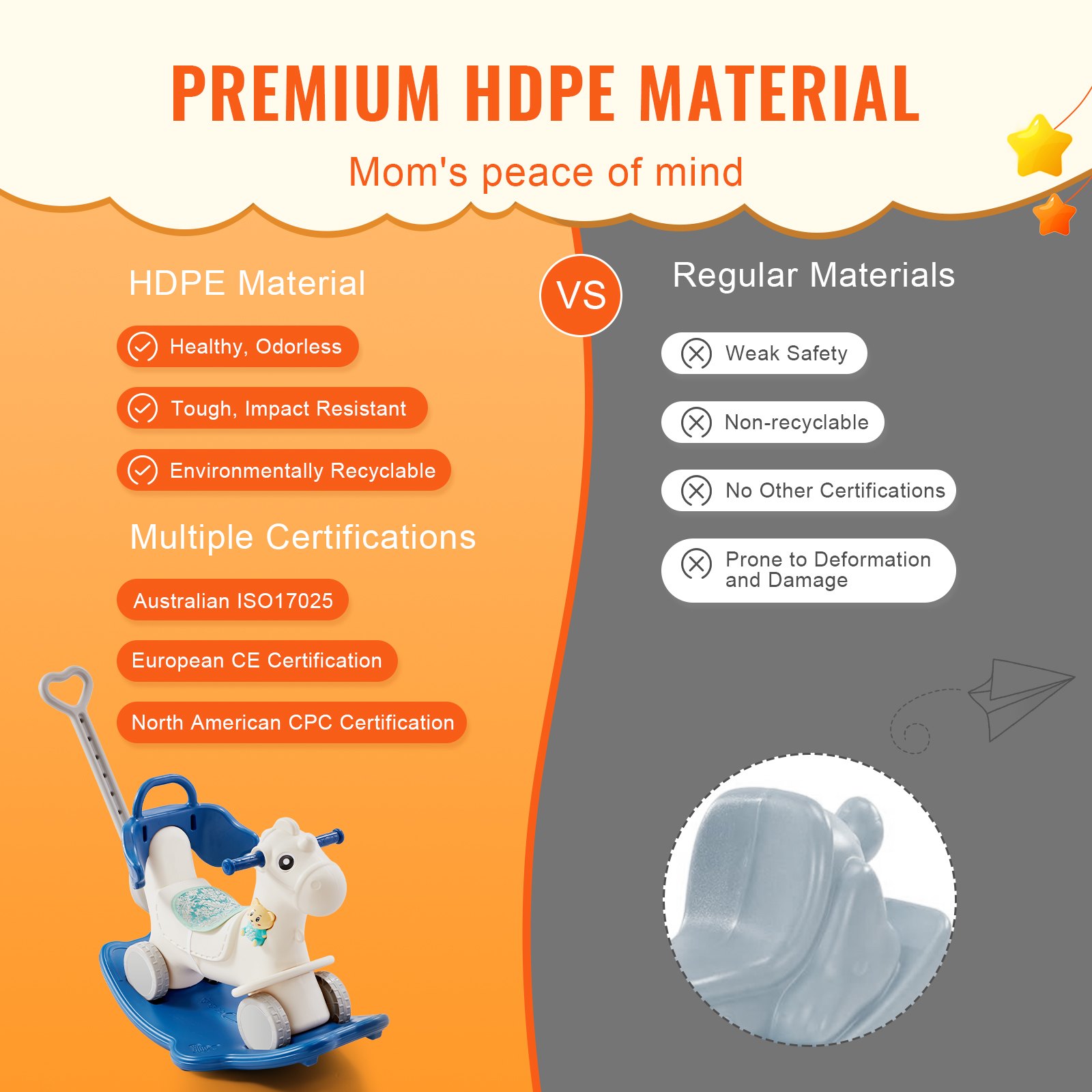 Safety comes first. Made from high-density polyethylene (HDPE), this baby rocking horse is sturdy, durable, and non-toxic, ensuring it’s safe even if your little one decides to take a bite. The strong structure can easily support up to 80 lbs (36 kg) and has passed multiple certifications, providing a stable play environment for your child.