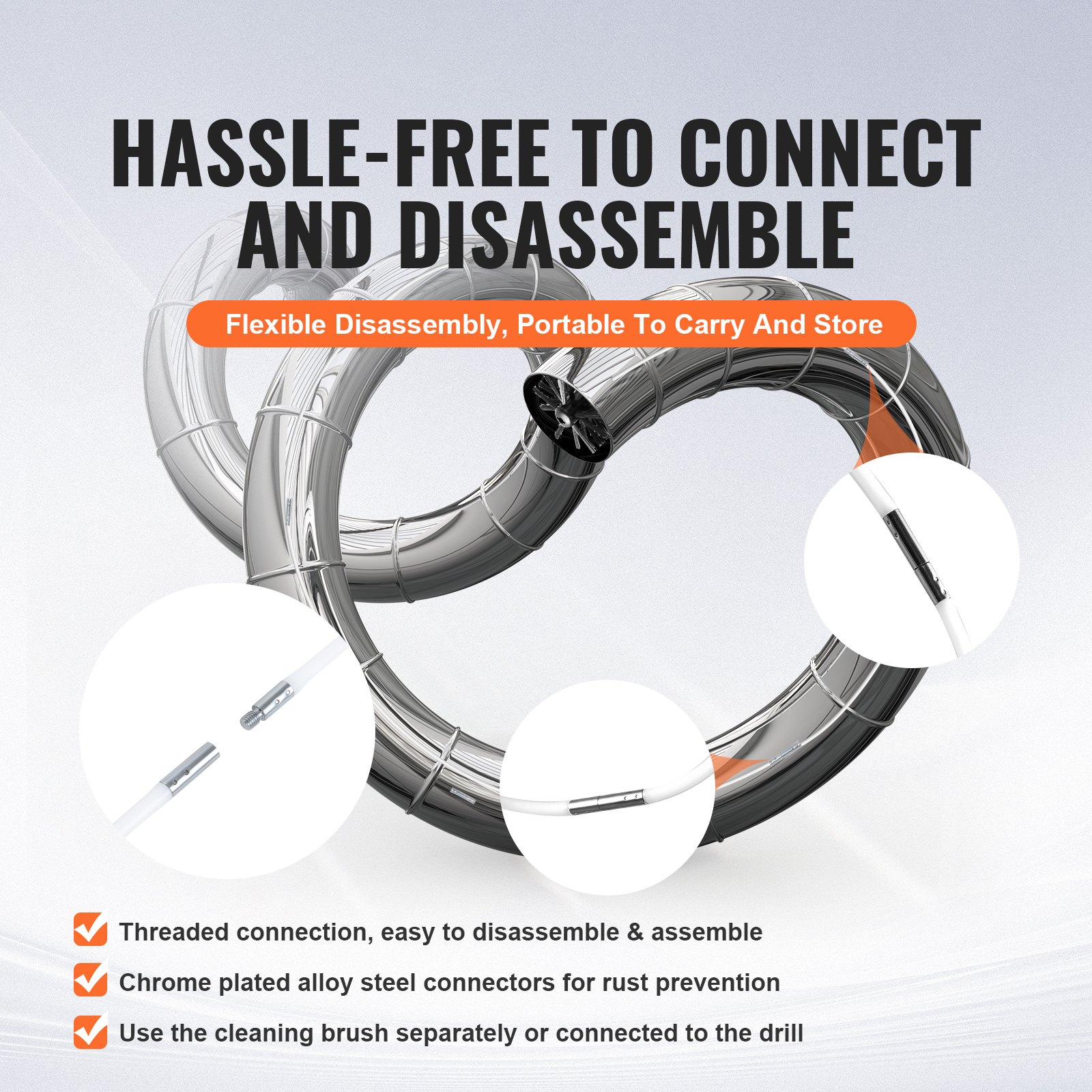 This pipe cleaning brush can quickly extend up to 30 feet, allowing you to easily reach distant or deep sections of pipes, such as those running through roofs, basements, and attic spaces. By expanding the cleaning range, it greatly enhances cleaning efficiency.