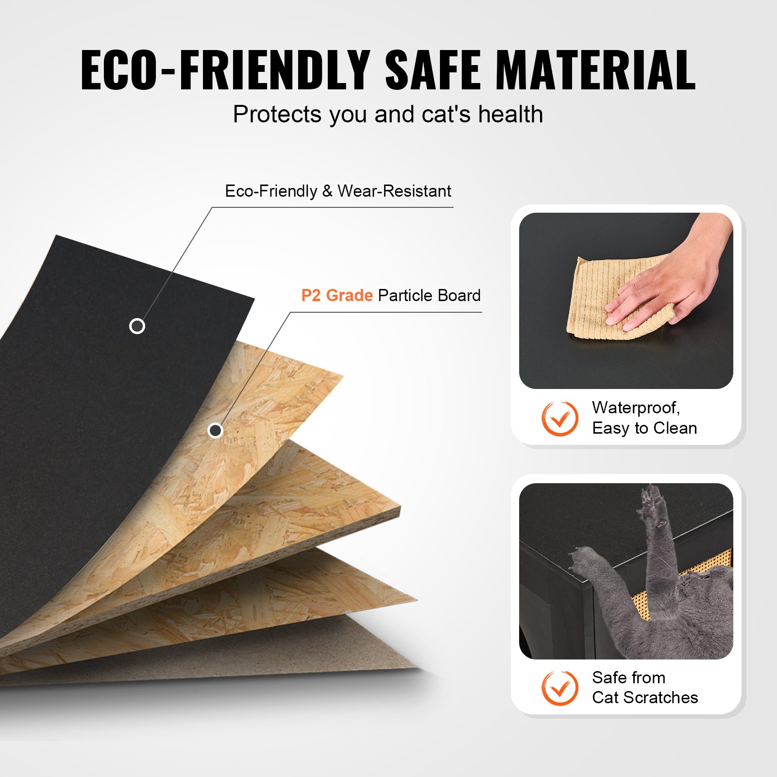 The P2 grade particle board ensures the health and safety of pets and your whole family. The high-quality finish surface with smooth edges is waterproof, easy to clean and maintain, wear-resistant and damage-resistant, and not afraid of cat scratching. The board is pre-drilled and numbered for your convenience.