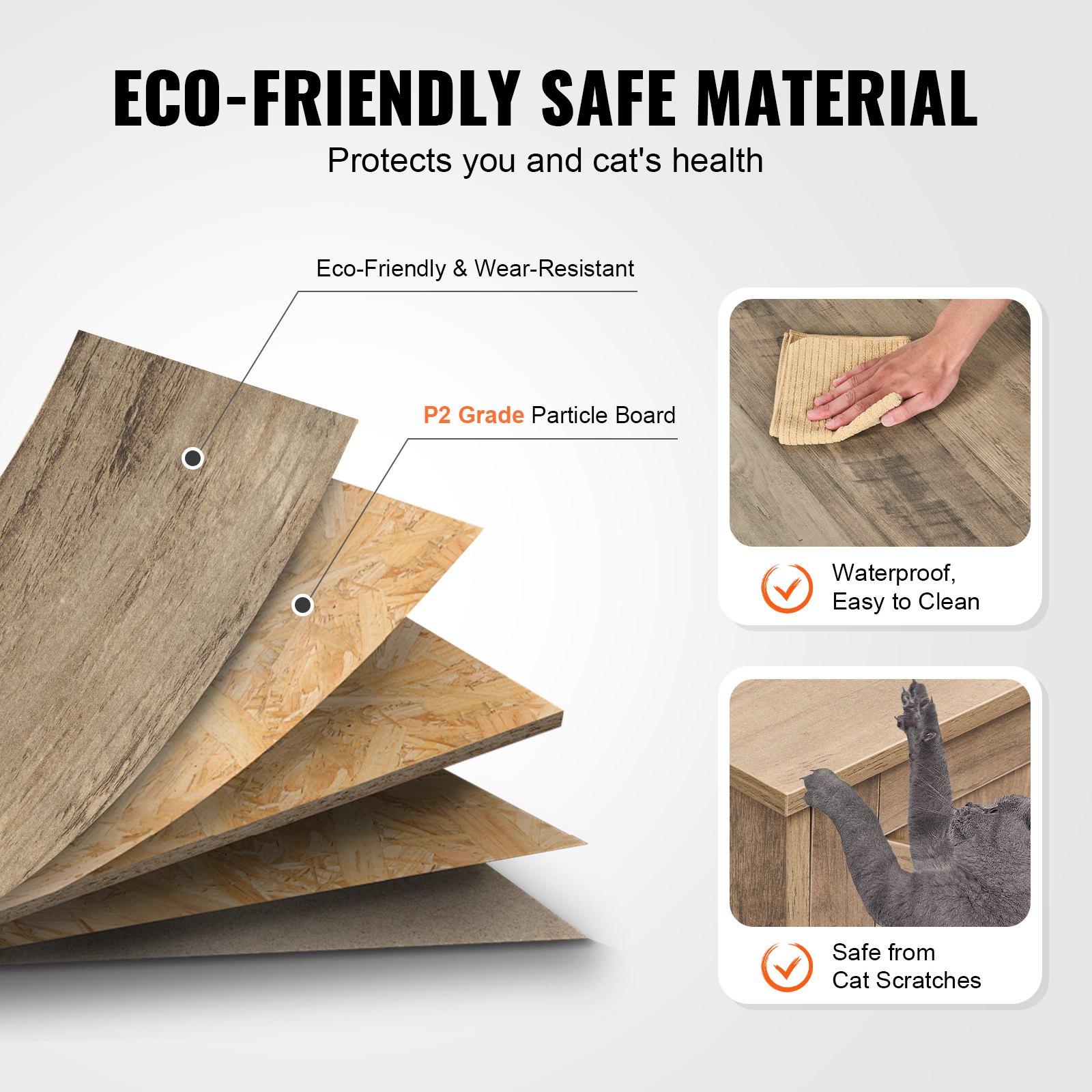 The P2 grade particle board ensures the health and safety of pets and your whole family. The high-quality finish surface with smooth edges is waterproof, easy to clean and maintain, wear-resistant and damage-resistant, and not afraid of cat scratching. The board is pre-drilled and numbered for your convenience.