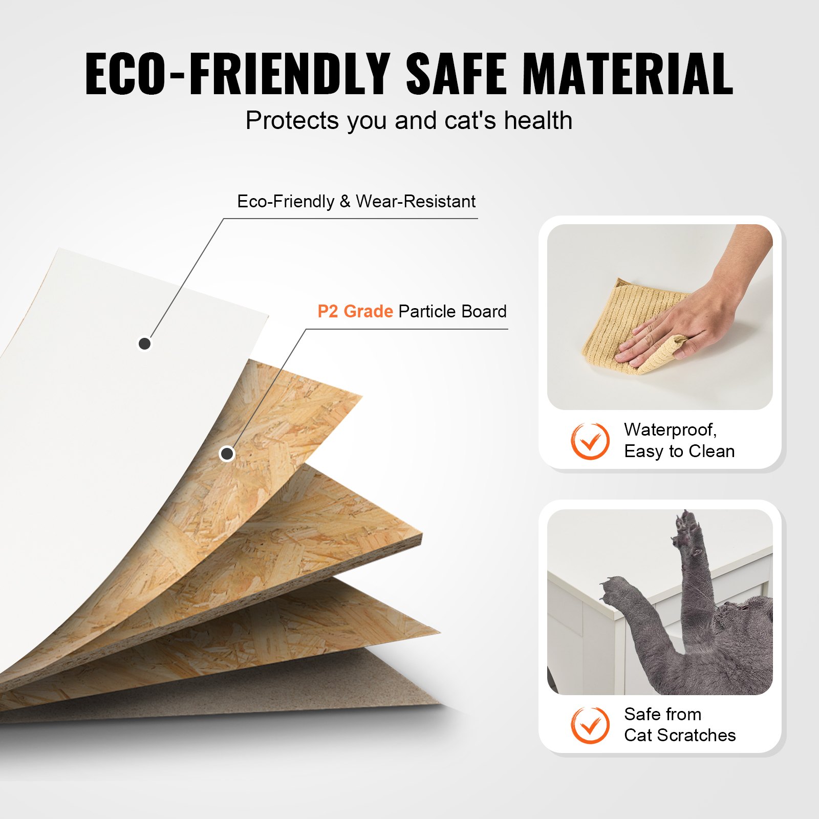 The P2 grade particle board ensures the health and safety of pets and your whole family. The high-quality finish surface with smooth edges is waterproof, easy to clean and maintain, wear-resistant and damage-resistant, and not afraid of cat scratching. The board is pre-drilled and numbered for your convenience.