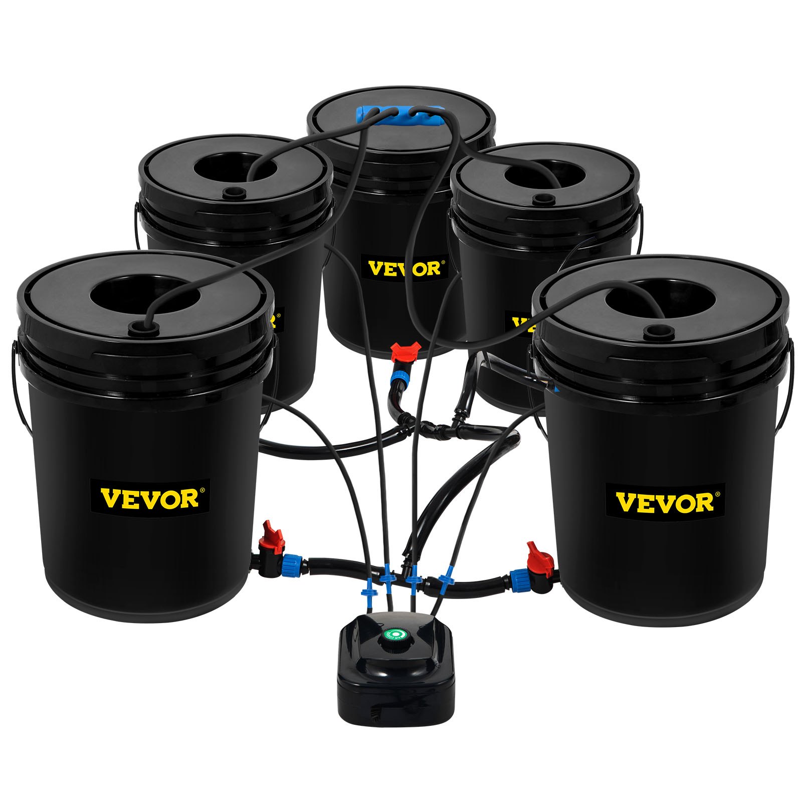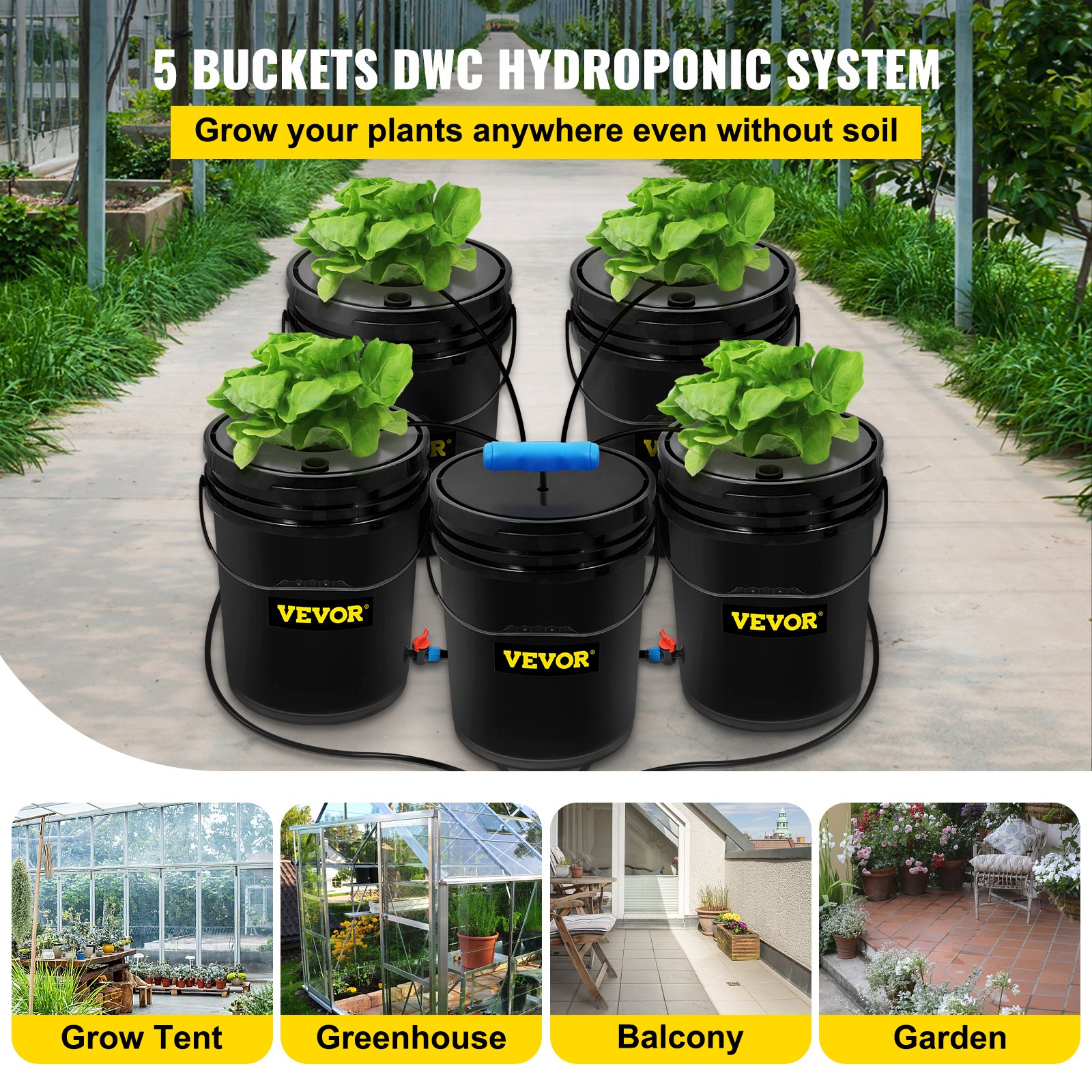 VEVOR DWC Hydroponic System, 5 Gallon 5 Buckets, Deep Water Culture Growing Bucket, Hydroponics Grow Kit with Pump, Air Stone and Connected Reservoir, for Indoor/Outdoor Leafy Vegetables