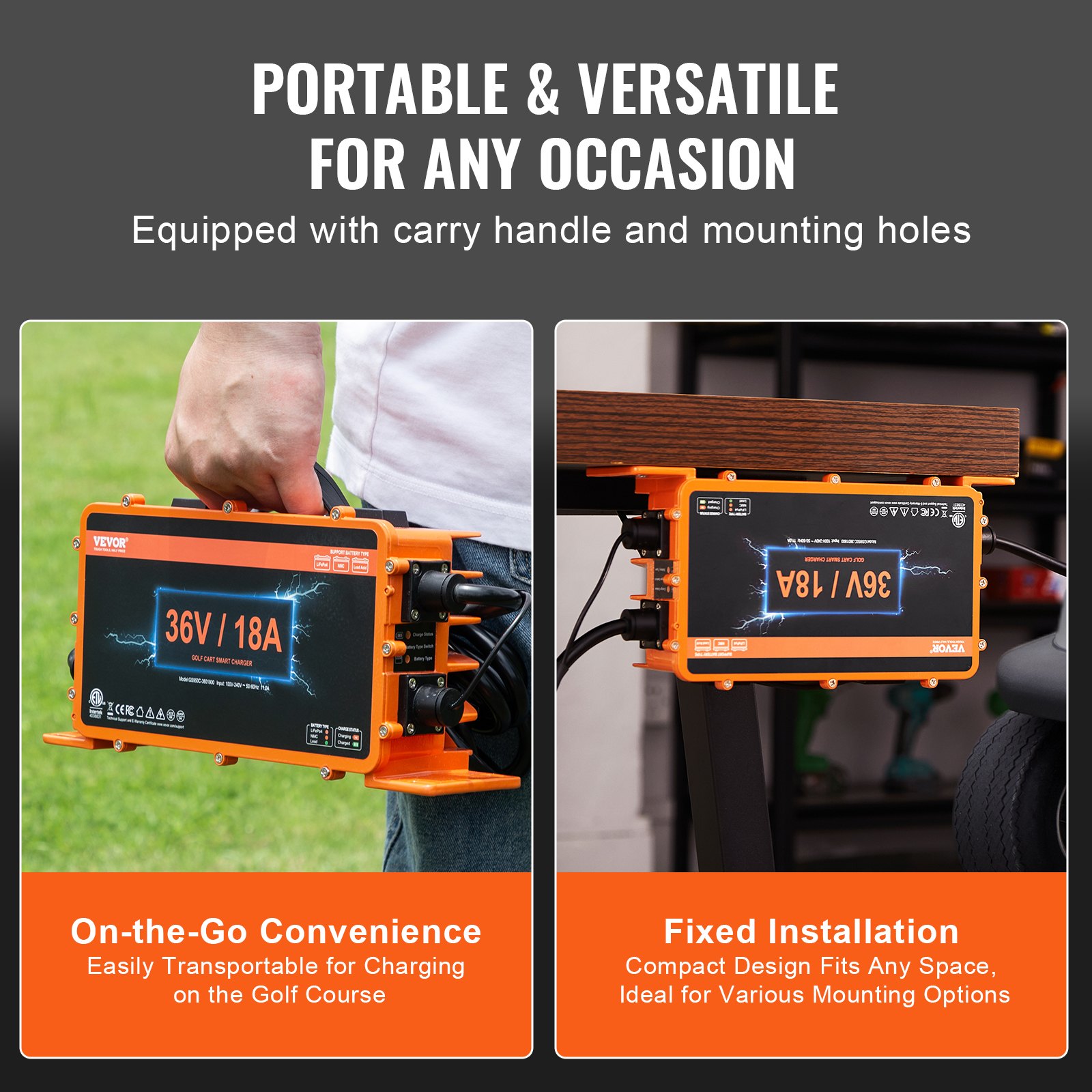 Our golf cart battery charger features a convenient carry handle, making it effortless to transport across the golf course for on-the-go charging. The built-in mounting holes allow for secure installation anywhere, ensuring it stays firmly in place. Its compact design saves space and fits perfectly in various environments, meeting all your storage needs.