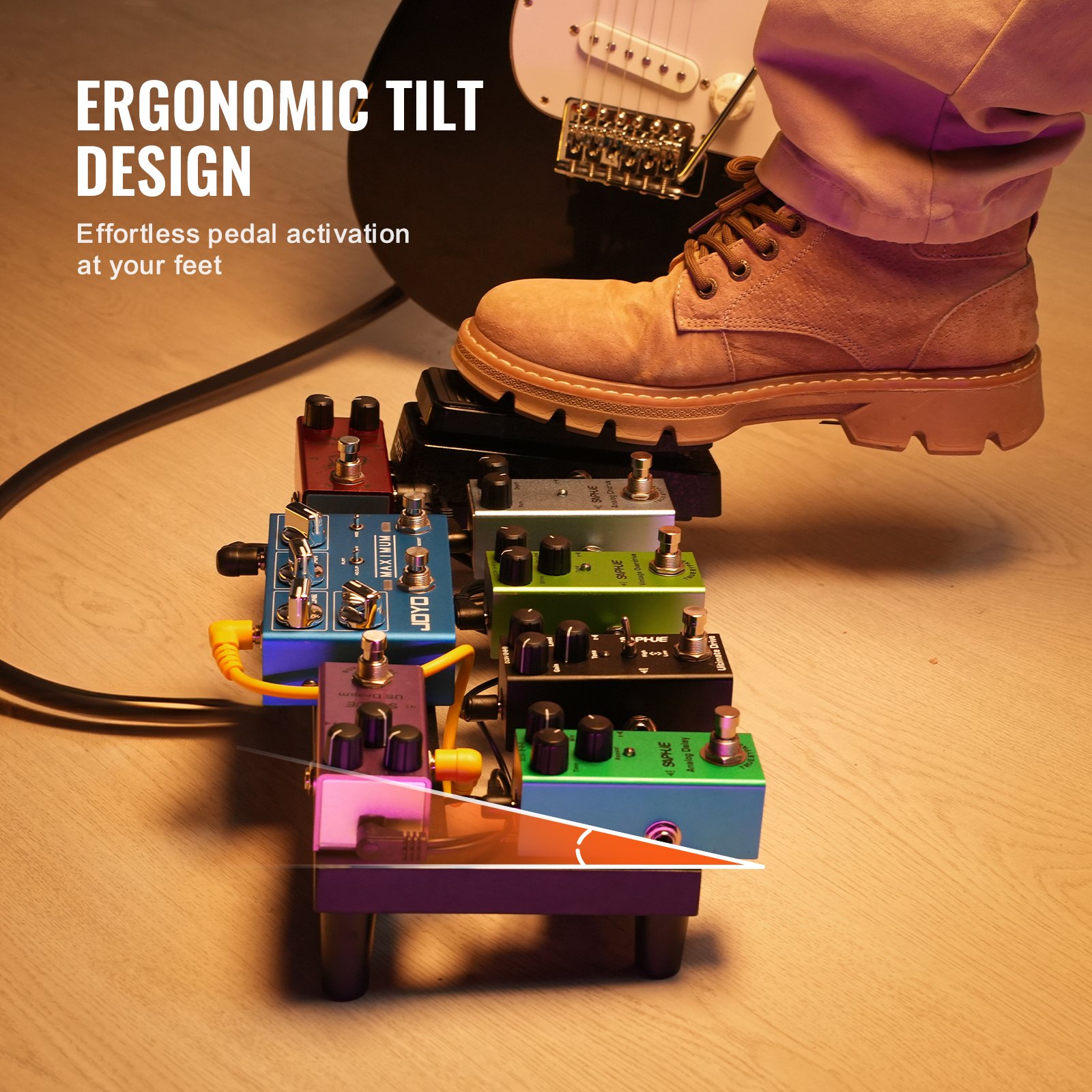Our guitar pedalboard features an ergonomic tilt design, ensuring prolonged use won’t strain your back, while making pedal engagement a breeze. Perfect for solo creatives and professional bands alike, it enhances your playing experience with every session. Plus, with added non-slip feet at the bottom, it stays securely in place during use, avoiding any unwanted shifting or scratches on your storage bag when packed away.