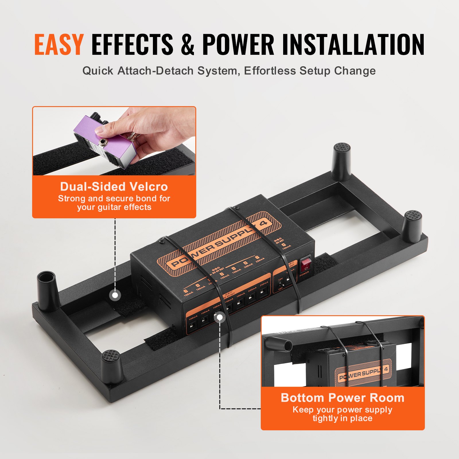 Our guitar pedal board is equipped with high-quality Velcro, securely adhering while easily detachable. With its bottom power supply compartment and included strap, your power source stays securely in place. In addition, we’ve added a 5 cm wide Velcro pre-attached to the pedalboard, allowing you to easily customize and attach it to your pedal’s backside for effortless use.