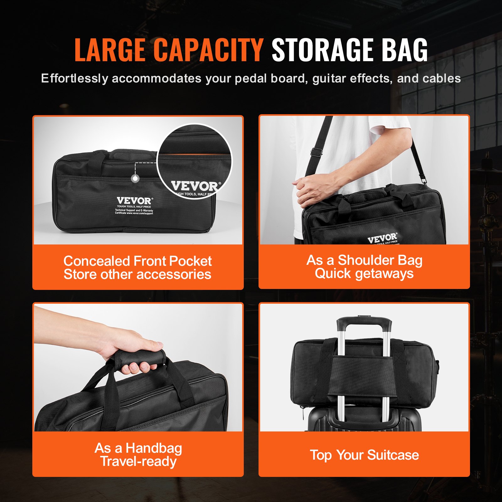 Designed for easy portability, our guitar pedal board comes with a dedicated large-capacity storage bag that doubles as a handbag or shoulder bag, and can even be securely attached to your luggage. Even after placing the pedalboard inside, there’s still plenty of space left. Inside, you’ll find secure straps for storing the pedalboard. The exterior features side pockets perfect for storing additional accessories. Enjoy unmatched convenience on the go!