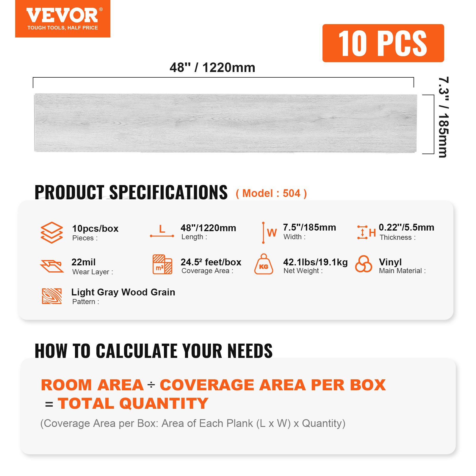 VEVOR Interlocking Vinyl Floor Tiles 48 x 7.3 inch, 10 Tiles 5.5mm Thick Snap Together, Light Gray Wood Grain DIY Flooring for Kitchen, Dining Room, Bedrooms & Bathrooms, Easy for Home Decor