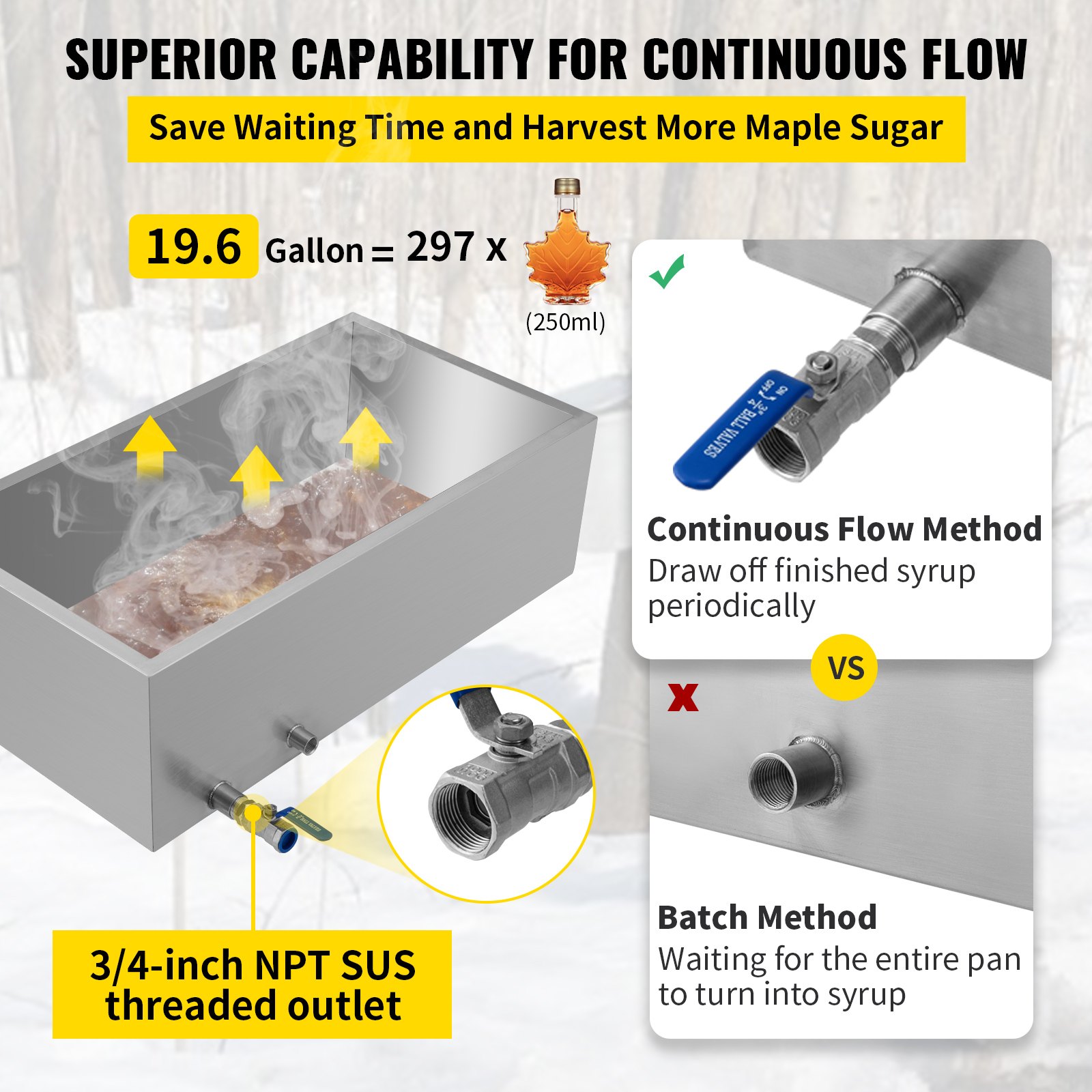 Handle nearly 19.6 gallons of sap in total, meaning 297 bottles of 250ml maple syrup can be made. The maple syrup pan comes with a 3/4-inch valve to adjust the flow rate and load the maple syrup into other containers.