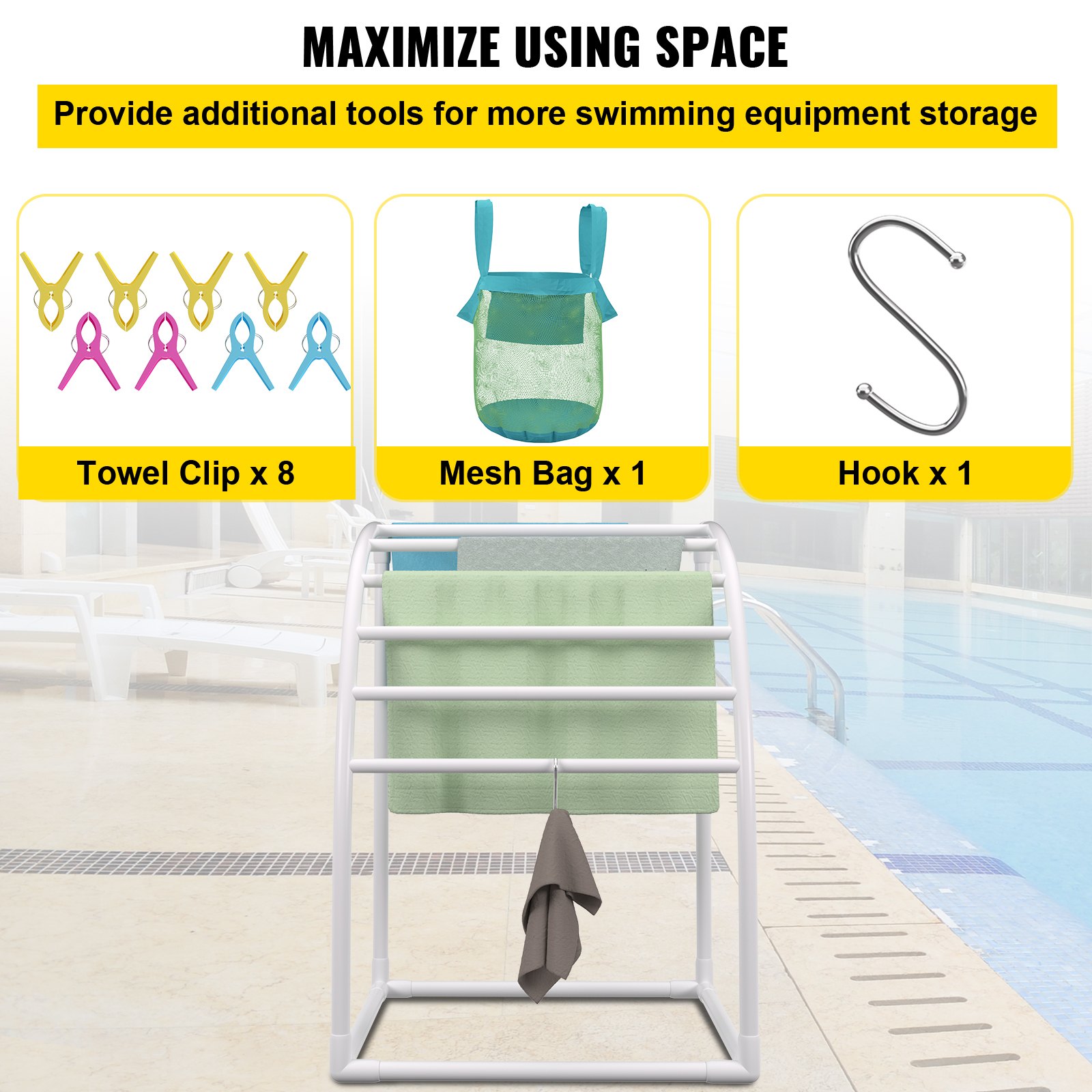 With a solid base, this outdoor pool rack stands firm under all weather conditions. Additionally, we include 8 small towel clips, a stainless steel hook, and a large mesh bag to organize your swimming essentials.