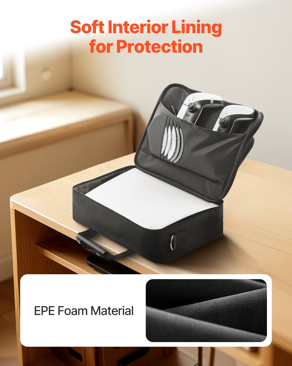 The PS5 carrying case features padded dividers between the console and accessories, keeping items securely in place and minimizing the risk of scratches or bumps during transport