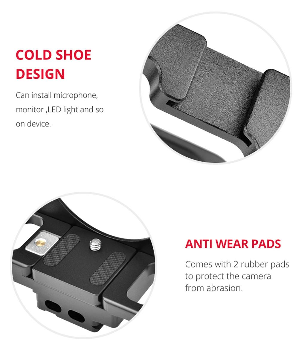 • 1/4 and 3/8 threaded holes on handle and cage for compatibility with accessories.
