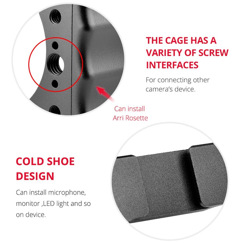 • 1/4 and 3/8 threaded holes, cold shoe port, and Arri Rosette positioning external interfaces for external equipment compatibility