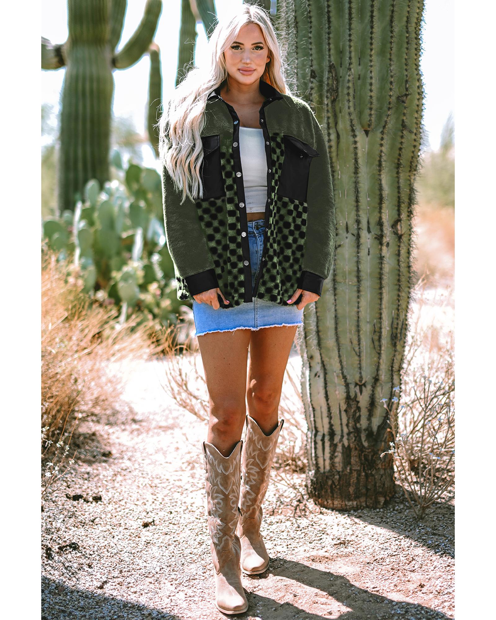 Vineyard Green Fleece Checkerboard Flap Pocket Snap Button Jacket - 2XL