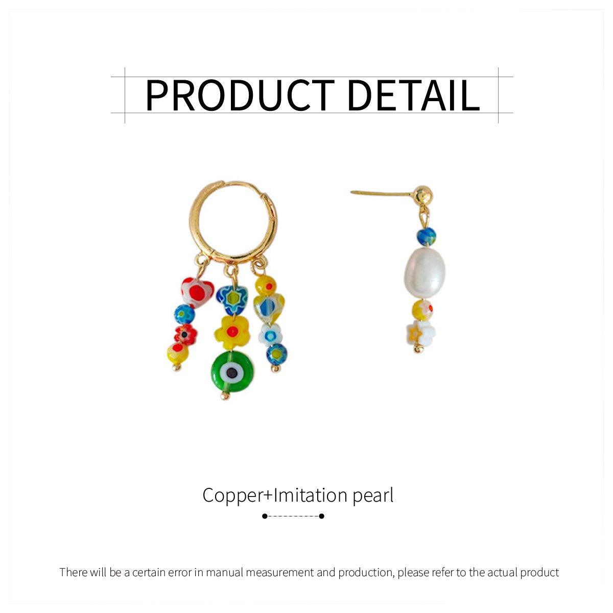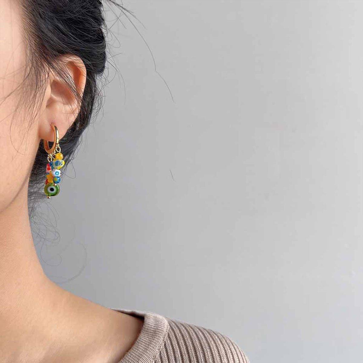 Celebrate individuality with these vintage asymmetrical earrings, featuring a bold contrast of colour, shape and length. One earring showcases a playful cluster of handmade millefiori floral glass charms and a bold buckle-style hoop, while the other features a minimalist pearl drop—creating an effortlessly chic mismatched look. Lightweight and eye-catching, this unique design is perfect for those who love boho accessories with a modern twist. Whether styled for a weekend brunch or an artsy night out, these statement earrings add character and colour to any outfit. With each pair slightly different due to the handmade elements, you’re guaranteed a piece as unique as you are.