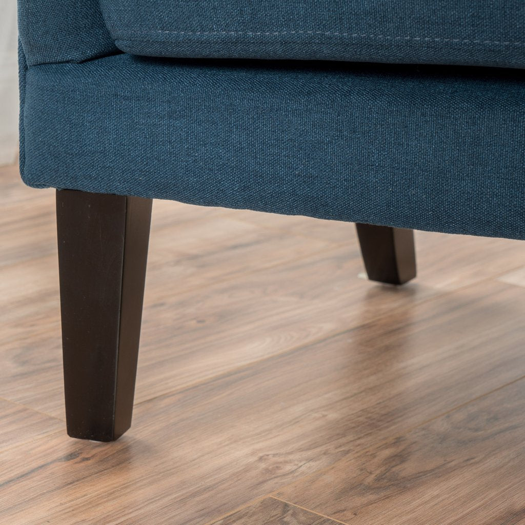 Upholstered in classyDark Blue Fabric theVintage design club chair provides a classic look to your living room bedroom or office. With soft Dark Blue Fabricupholstery and a well padded seat and back the Salerno will be your favourite arm chair for years to come. It is constructed with strong hardwood for increased durability and has nailhead accents for added flair.