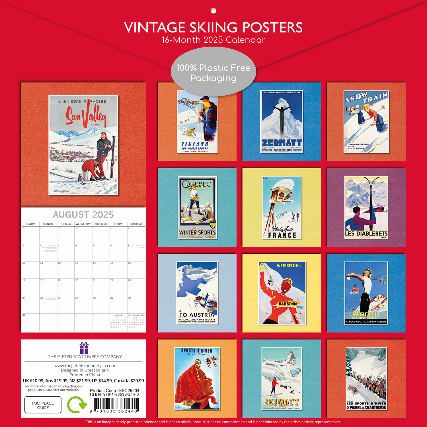 Relive the golden age of winter sports with our “Vintage Skiing Posters” 2025 calendar. Evoking snowy slopes and retro charm, it’s perfect for skiing enthusiasts and vintage lovers.This beautifully designed, brand-new calendar is both 100% plastic-free and fully recyclable. It comes shrink-wrapped in its original packaging and features: